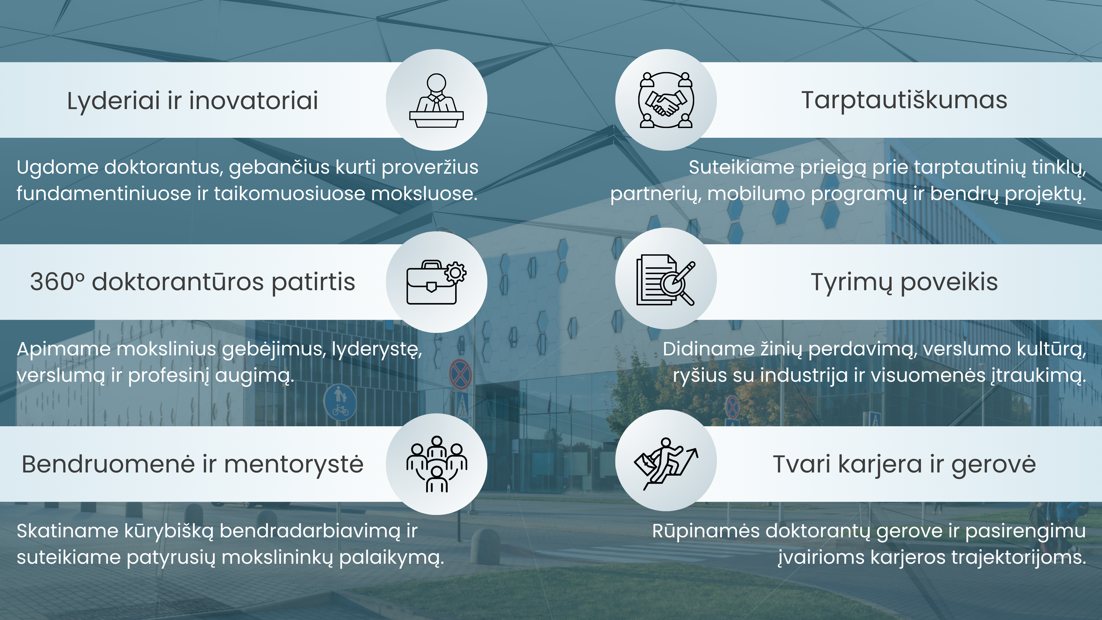 Tai studijos motyvuotiems ir ambicingiems tyrėjams, siekiantiems kurti naujas žinias, formuoti inovacijų ekosistemą ir kurti tarptautinę mokslinę ar technologinę karjerą.