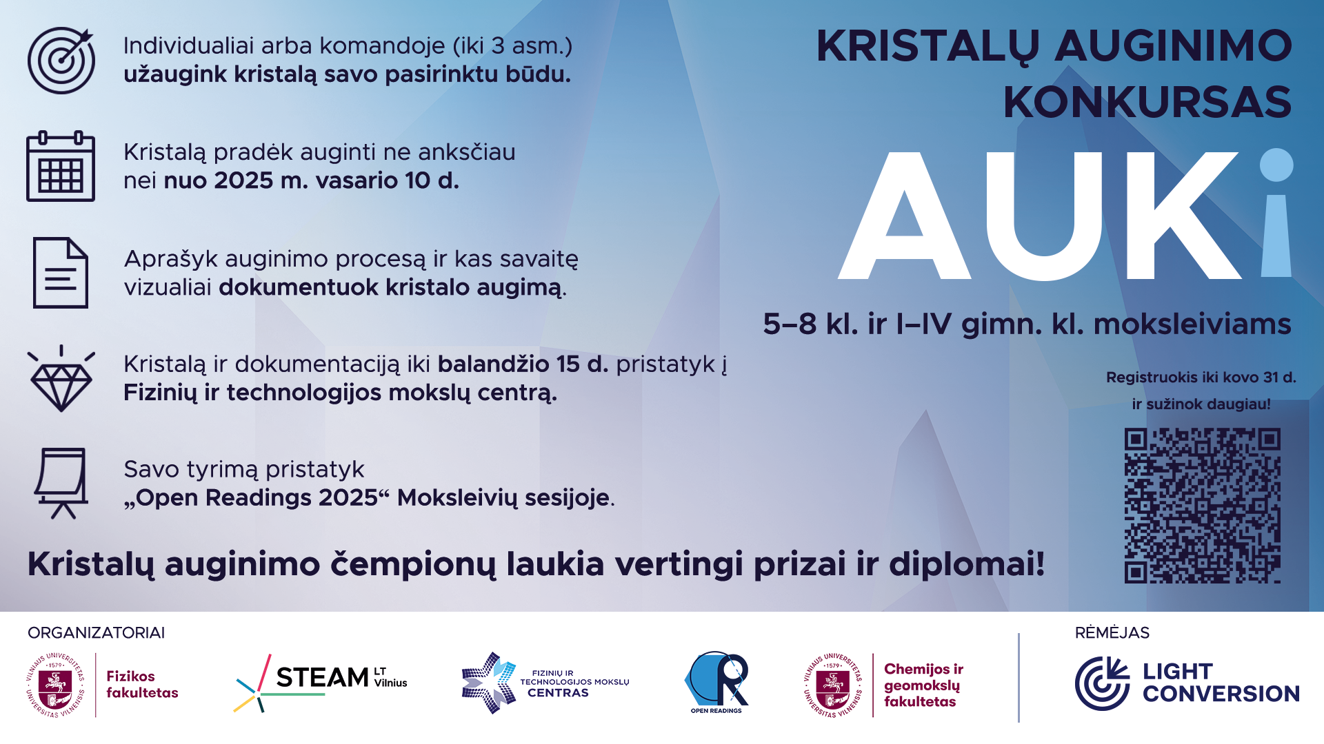 „Kristalai lydi mus kasdien – nuo žiupsnelio druskos ir LCD ekranų iki snaigių žiemą ar smėlėtų paplūdimių vasarą. Šis konkursas suteikia mokiniams unikalią galimybę ne tik pažinti kristalus išsamiau, bet ir tapti jų kūrėjais bei augimo sąlygų tyrėjais. Juk būtent nuo pirmųjų eksperimentų prasideda mokslininko kelias, o net ir maži atradimai gali tapti didelių inovacijų pagrindu“, – teigia Vilniaus universiteto Metodinio STEAM ugdymo centro vadovas dr. Paulius Lukas Tamošiūnas.