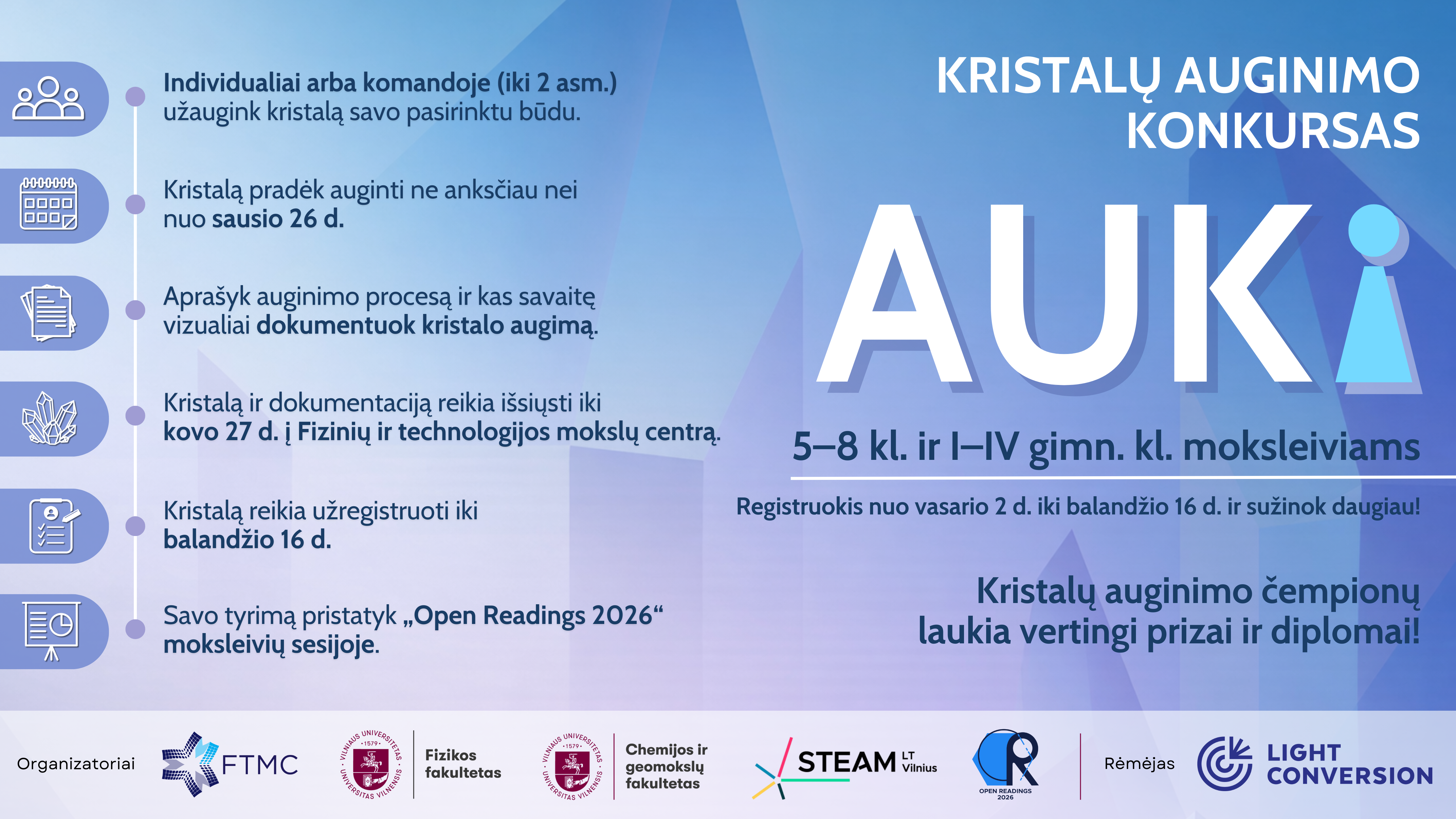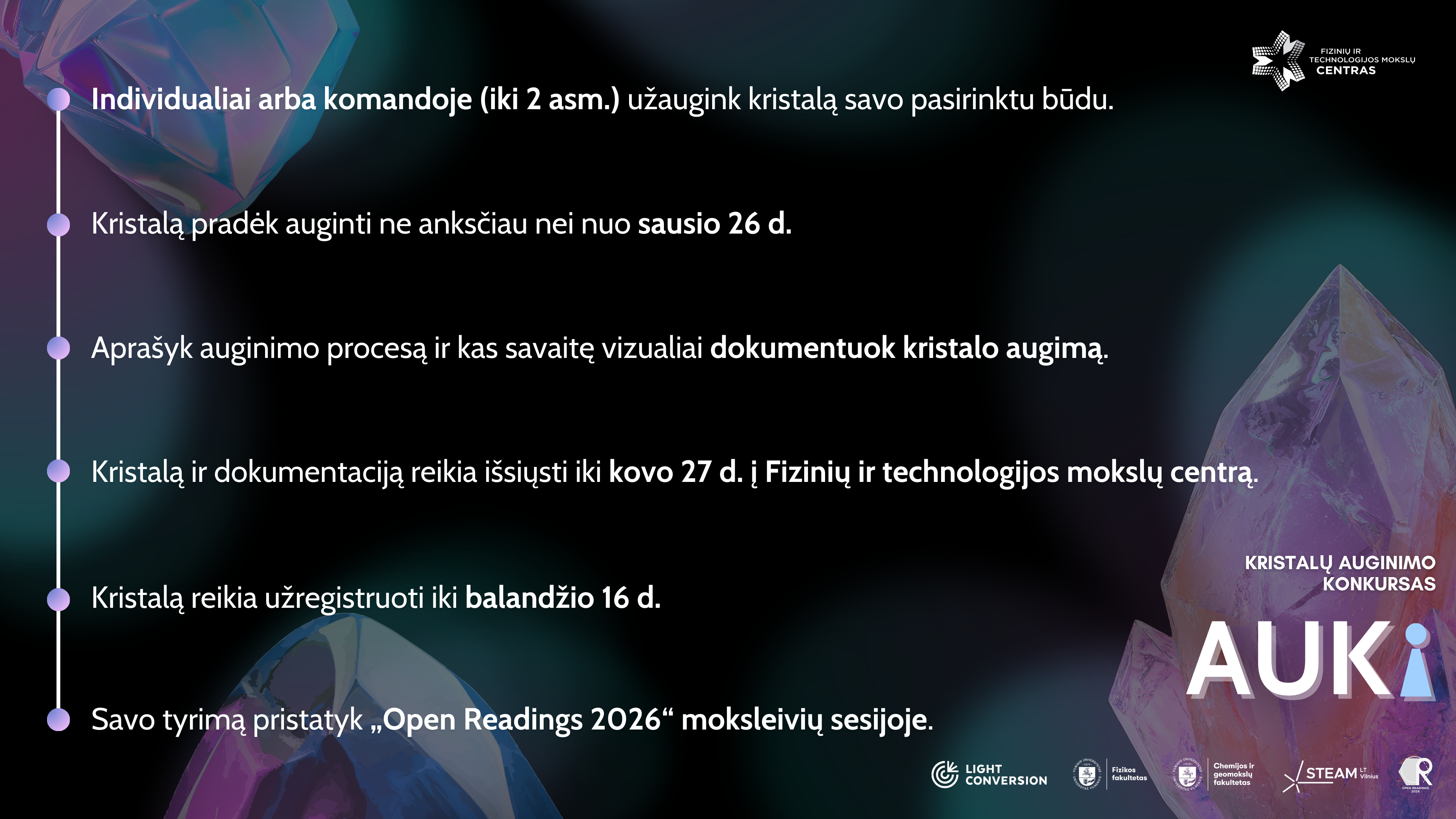 Dalyvauti gali 5–8 klasių ir I–IV gimnazijos klasių mokiniai, kurie varžysis individualiai arba komandomis iki 2 asmenų. Užauginkite kristalą savo pasirinktu būdu, aprašykite jo augimo procesą, iki 2026 m. kovo 27 d. kristalą bei dokumentaciją atsiųskite į Fizinių ir technologijos mokslų centrą (FTMC), o savo atradimus pristatykite studentų ir jaunųjų mokslininkų konferencijos „Open Readings“ moksleivių sesijos metu.