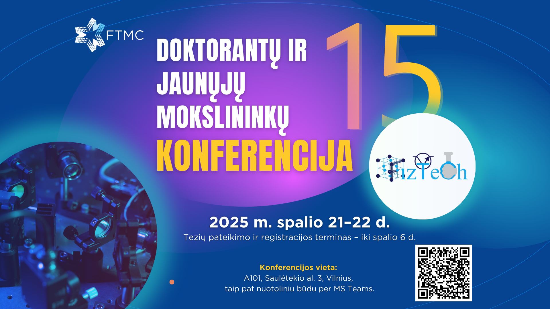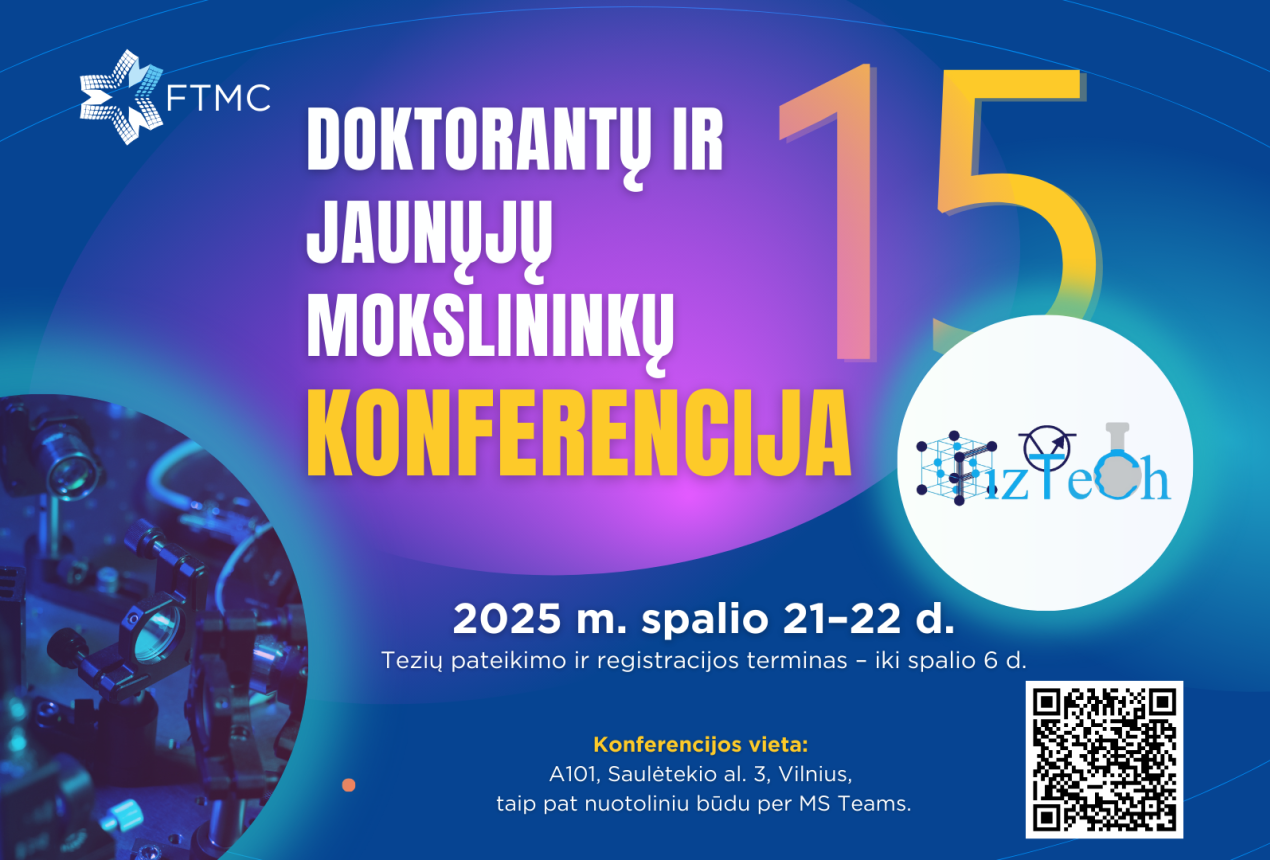 Spalio 21–22 d. FTMC kviečia į kasmetinę doktorantų konferenciją FizTeCh2025, kurioje bus pristatomi naujausi fizikos, chemijos ir medžiagų inžinerijos sričių tyrimai bei jų taikymo galimybės.