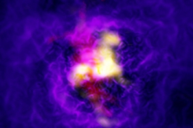 Galaktikų spiečiaus Abell 2597 centrinė galaktika submilimetriniuose (geltona), regimuosiuose (raudona) ir rentgeno (violetinė/mėlyna) spinduliuose. Šaltinis: ALMA (ESO/NAOJ/NRAO), Tremblay et al.; NRAO/AUI/NSF, B. Saxton; NASA/Chandra; ESO/VLT