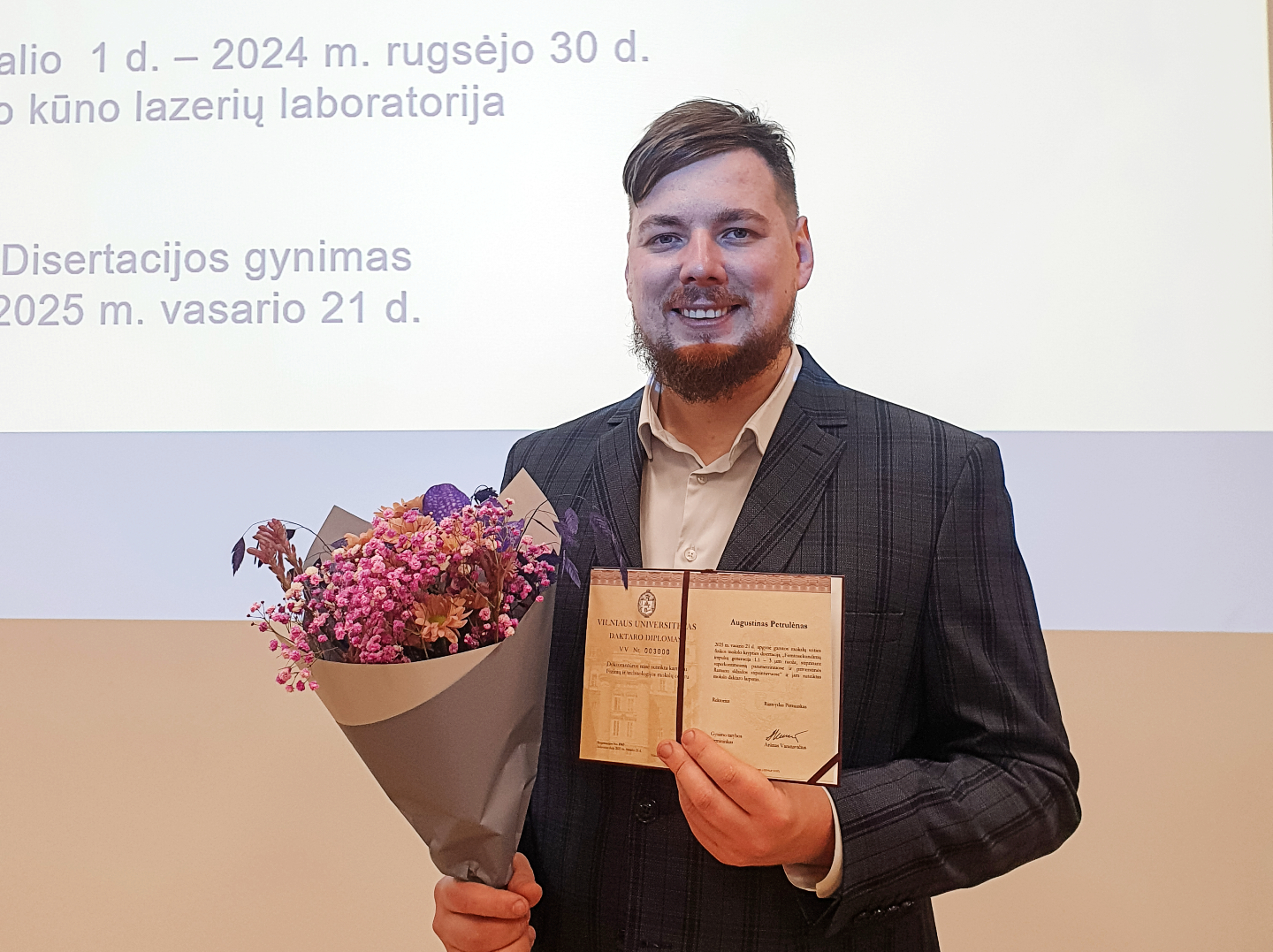 FTMC Lazerinių technologijų skyriaus Kieto kūno lazerių laboratorijos fizikas Augustinas Petrulėnas tapo gamtos mokslų daktaru. Jis šiandien apgynė disertaciją „Femtosekundinių impulsų generacija 1.1–3 μm ruože, stiprinant superkontinuumą parametriniuose ir priverstinės Ramano sklaidos stiprintuvuose“ (mokslinis vadovas: dr. Aleksėj M. Rodin).