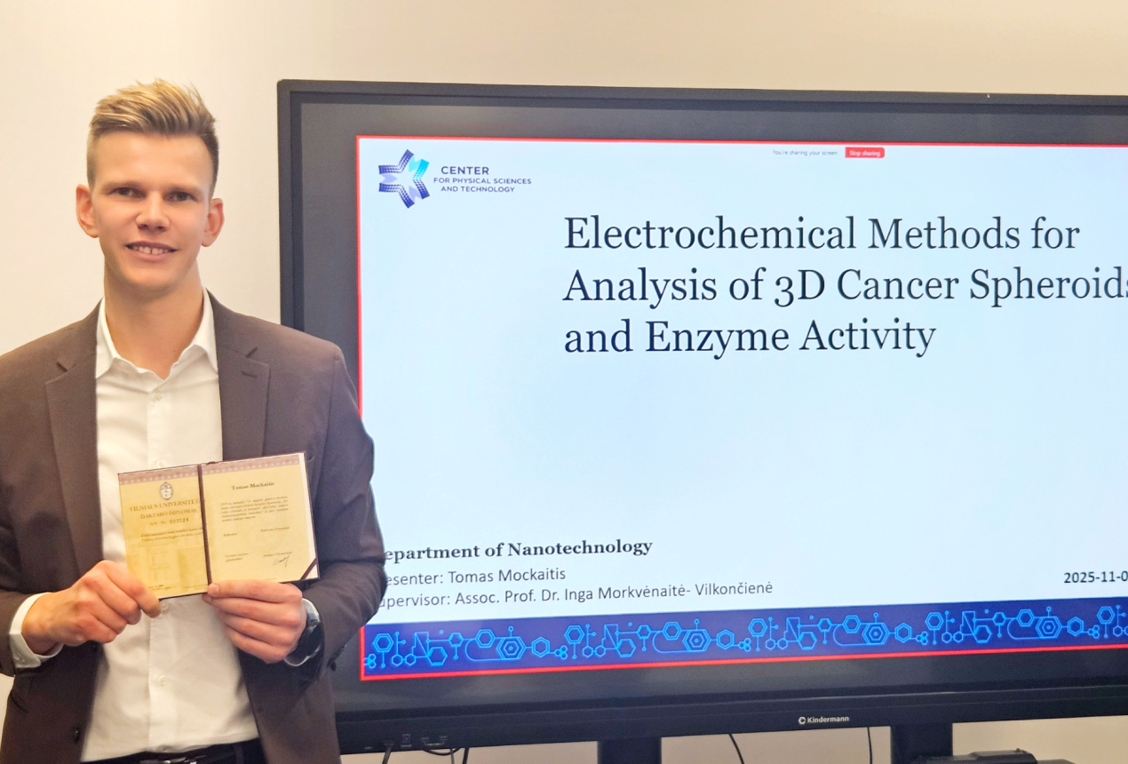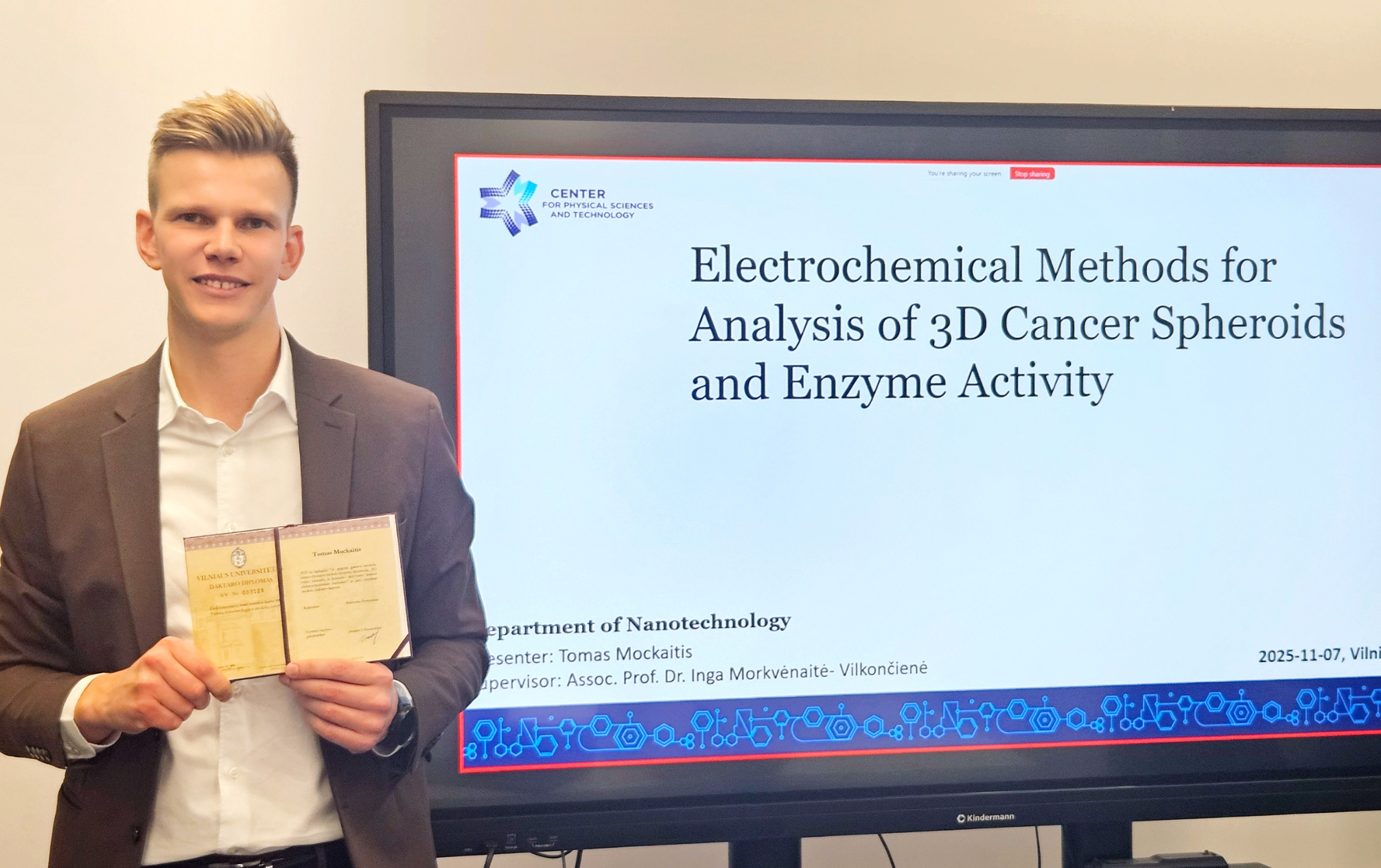 Ką daryti, kad tai pakeistume? FTMC Nanotechnologijų skyriaus chemikas dr. Tomas Mockaitis šiam tikslui siekia sukurti visiems prieinamą biojutiklį. Sėkmingi jo tyrimų rezultatai tapo disertacija, kurią Tomas apgynė lapkričio 7 d. Darbo tema: „3D vėžio sferoidų ir fermento aktyvumo analizė elektrocheminiais metodais“ (mokslinė vadovė: dr. doc. dr. Inga Morkvėnaitė-Vilkončienė).