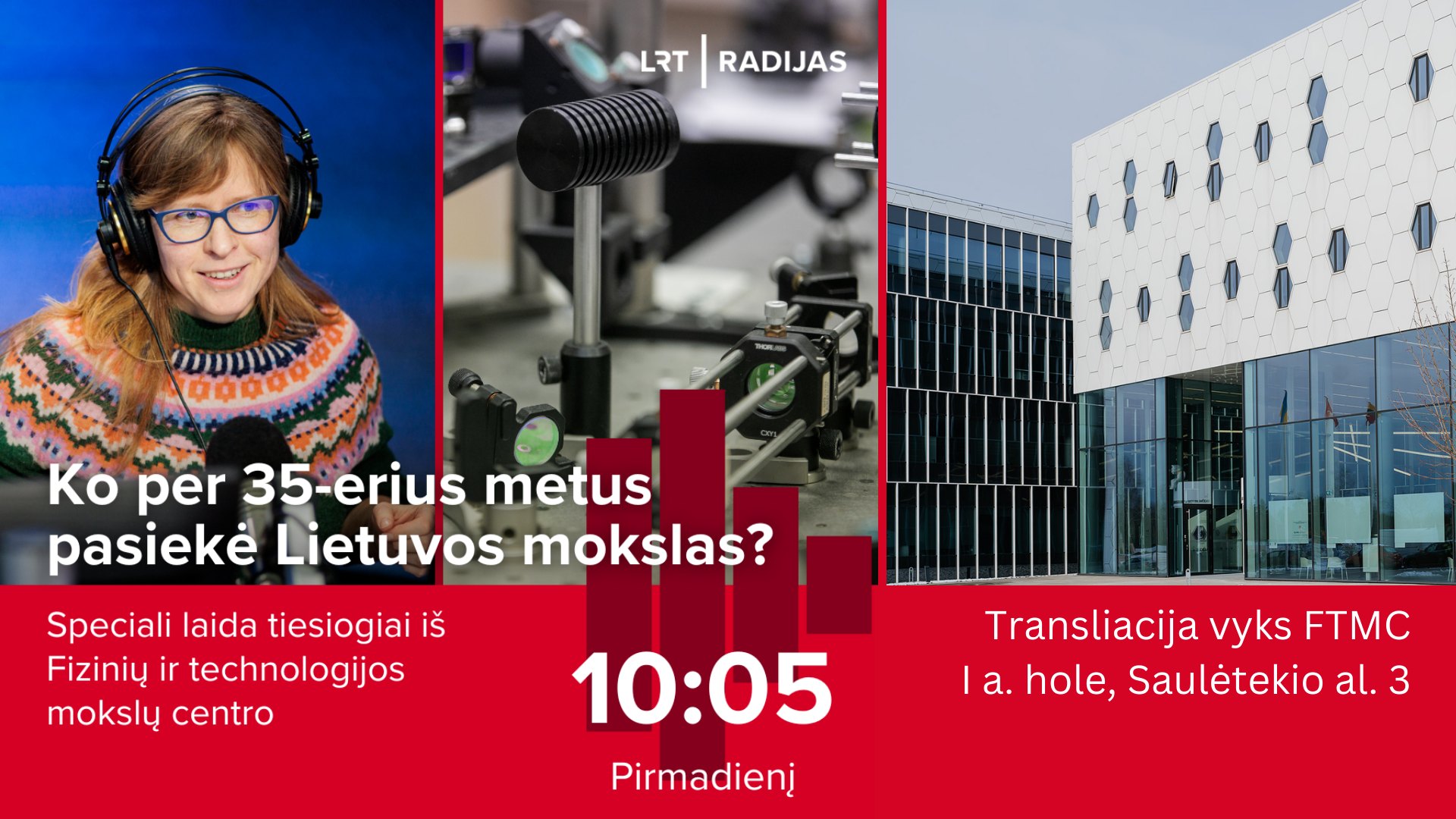 Artėjantį pirmadienį, vasario 24-ąją, nuo 10 iki 12 val. radijas tiesiogiai transliuos iš didžiausios mokslinių tyrimų organizacijos Baltijos šalyse – Fizinių ir technologijų mokslo centro (FTMC)! Pokalbiai vyks I aukšto hole (Saulėtekio al. 3, Vilnius).