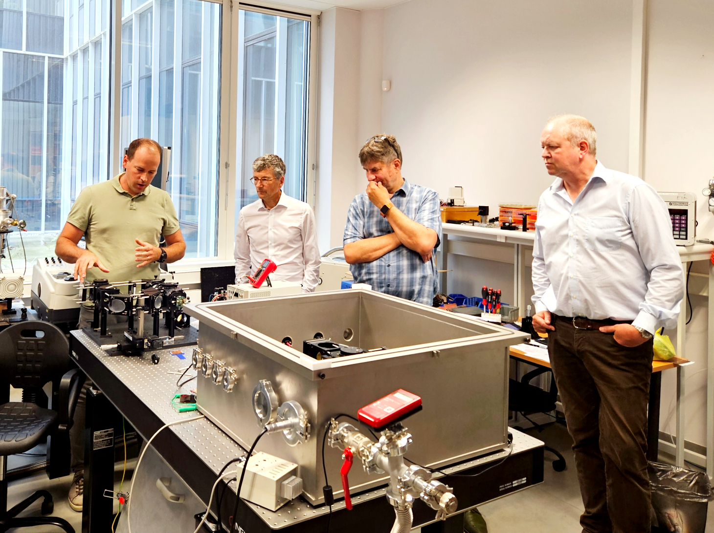 The meeting started with a visit to several of our laboratories. Dr. Zigmas Balevičius, a physicist at the FTMC Department of Laser Technologies, presented the work carried out in the Plasmonics and Nanophotonics Laboratory; Artur Plotnikov, Chief Engineer at the Department of Nuclear Research, talked about radiocarbon dating at the Accelerator Mass Spectrometry Laboratory; Dr. Jan Devenson from the Department of Optoelectronics demonstrated the molecular beam epitaxy (MBE) facility for growing crystalline semiconductor structures, and Dr. Linas Minkevičius, a physicist in the same department, presented terahertz radiation research in the Terahertz Photonics Laboratory.