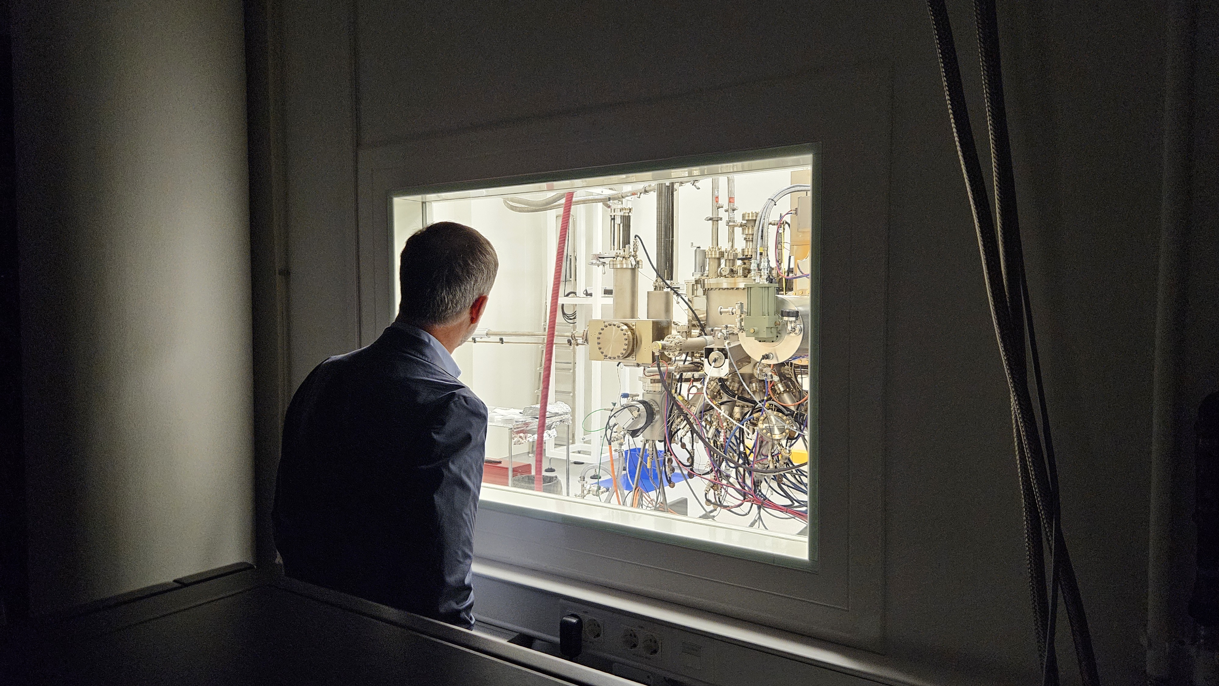 (Dr Dirk Holste, Head of the EARTO WG Emerging Technologies for Healthcare, takes a look at the Molecular Beam Epitaxy (MBE) equipment. Photo: FTMC)