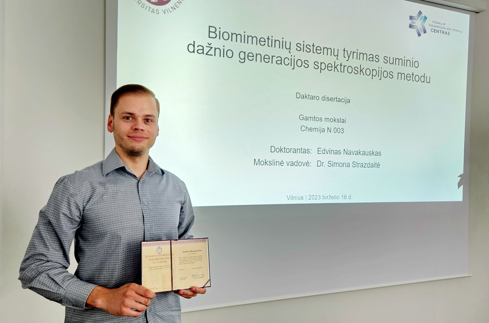 Edvinas Navakauskas, a Senior Engineer at the Department of Organic Chemistry of FTMC, became a PhD in Natural Sciences. He defended his thesis on "Biomimetinių sistemų tyrimas suminio dažnio generacijos spektroskopijos metodu" ("Investigation of biomimetic systems by sum frequency generation spectroscopy"). Scientific supervisor is Dr. Simona Strazdaitė.
