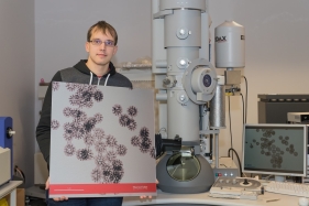 Martynas helds the image CoFe nanoparticles printed by Thermo Fisher on a plate of aluminium alloy and on the PC monitor one can see the original image.