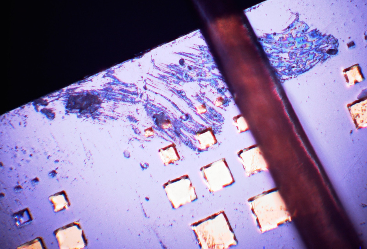 (Square quantum superlattices and a human hair on the right. Photo: Vladislovas Čižas / FTMC)