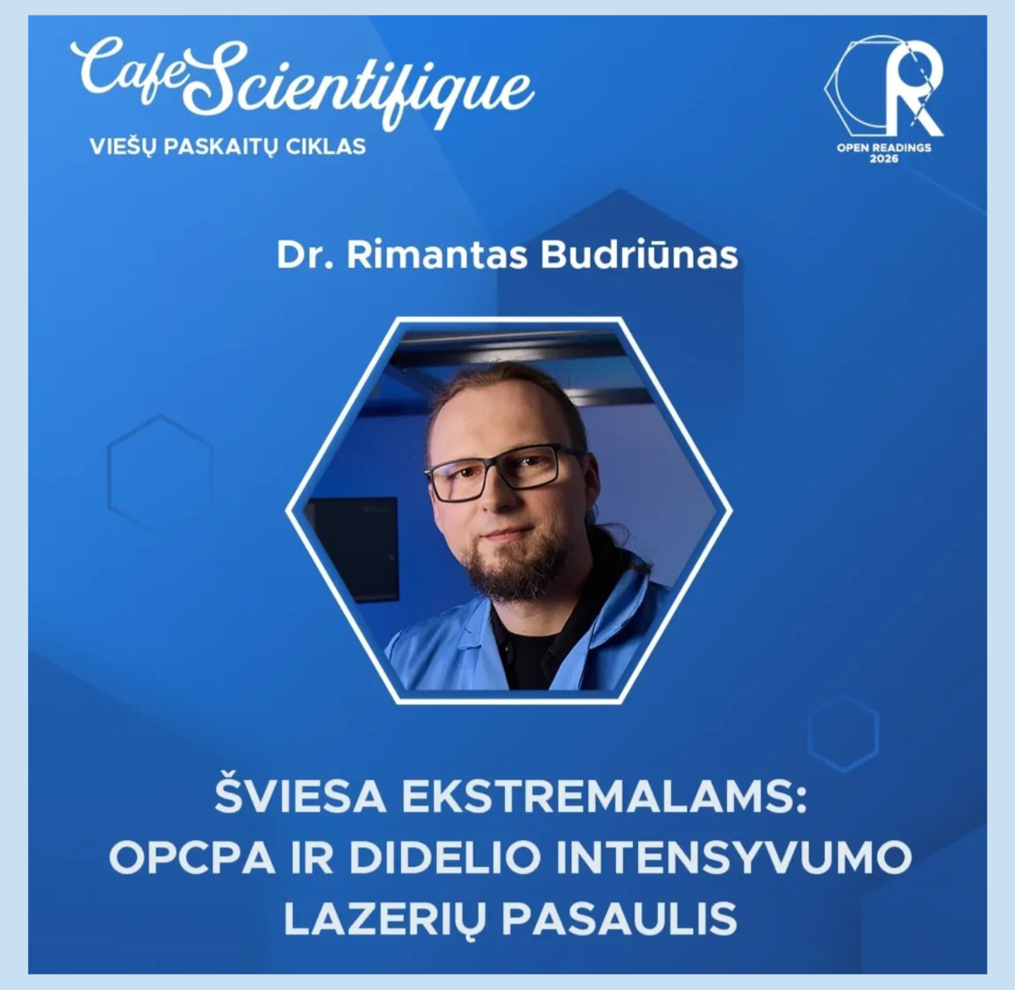 Kaip veikia galingiausi pasaulio lazeriai? Kam jie naudojami? Ir kodėl OPCPA technologija tapo tokia svarbi šiuolaikiniams eksperimentams? Į šiuos ir kitus klausimus paskaitos metu atsakys Vilniaus universiteto Lazerinių tyrimų centro mokslininkas dr. Rimantas Budriūnas.