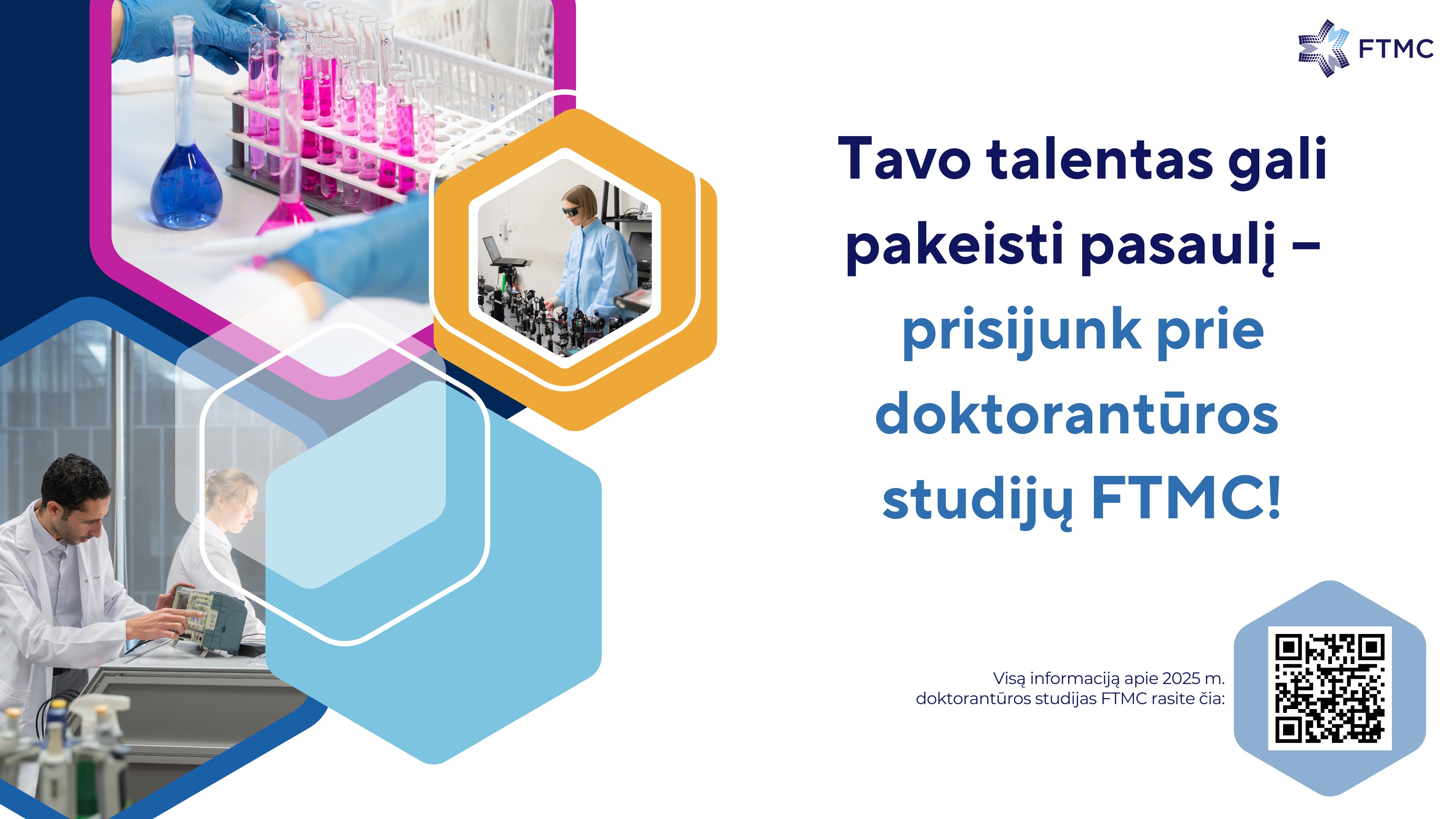 Fizinių ir technologijos mokslų centras (FTMC) skelbia priėmimą į 2025 metų doktorantūros studijas. Tai unikali galimybė augti vienoje moderniausių institucijų Baltijos šalyse, kur mokslas virsta realiomis technologijomis, o idėjos – pasaulinio lygio sprendimais.