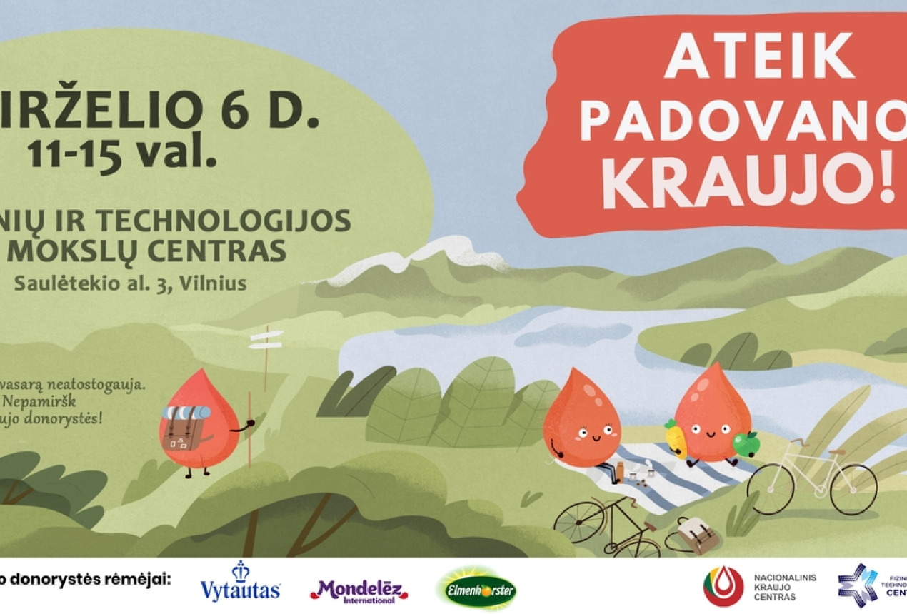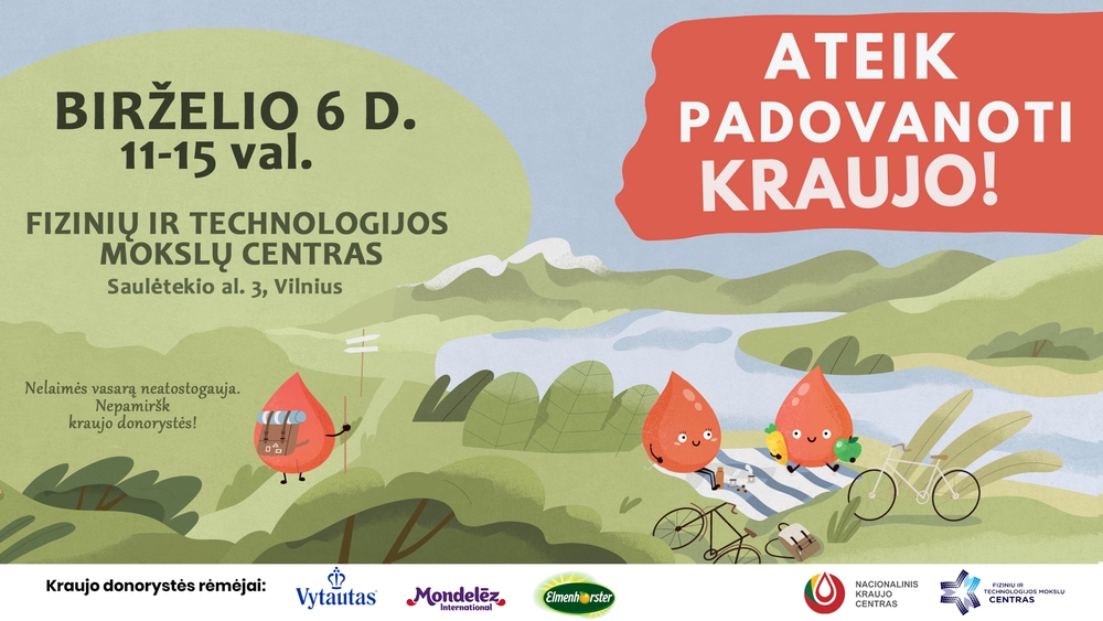 Nacionalinis kraujo centras maloniai kviečia Jus į kraujo donorystės akciją, kuri įvyks Fizinių ir technologijos mokslų centre (Saulėtekio al. 3) 2023 m. birželio mėn. 6 d. (antradienį) nuo 11 iki 15 val.