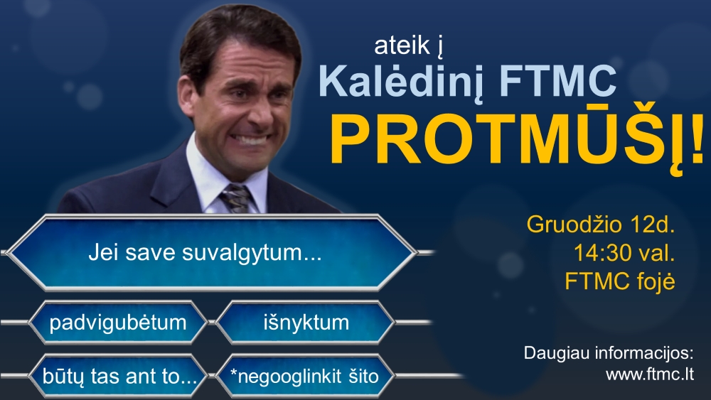 Ir vėl atėjo laikas, kai galite pasišpilkuoti su savo kolegomis kuris per šiuos metus sukaupė didesnį žinių bagažą. Kviečiame į Kalėdinį FTMC protmūšį!