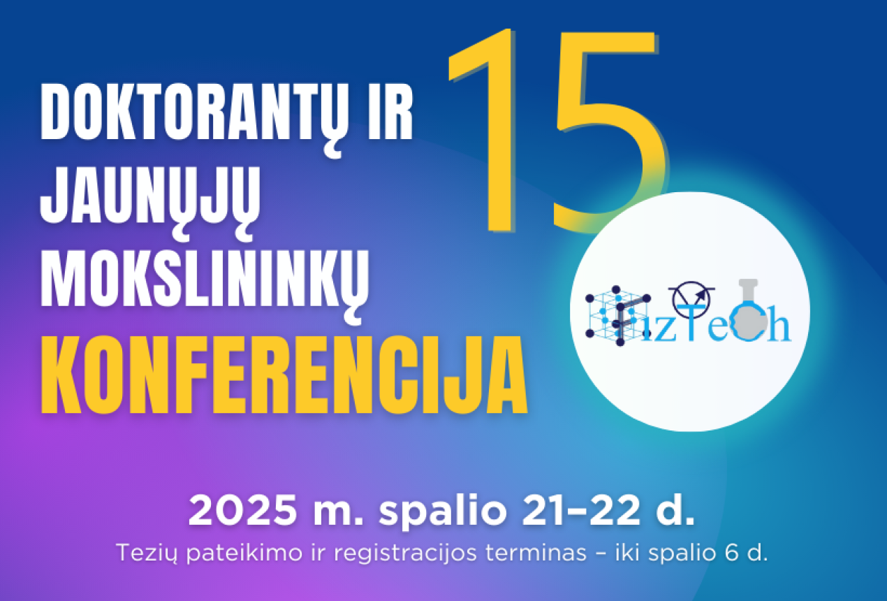 Š. m. spalio 21–22 dienomis vyks Fizinių ir technologijos mokslų centro doktorantų konferencija FizTeCh2025, kurios metu Fizikos, Chemijos bei Medžiagų inžinerijos mokslo krypčių doktorantai pristatys savo atliekamus mokslinius tyrimus, gautus rezultatus ir jų taikymo galimybes. II-rų ir III-čių metų doktorantai (t.y. tie, kas 2024–2025 m.m. studijavo II ir III metus) privalo daryti žodinius pranešimus. Kitų studijų metų doktorantai taip pat gali dalyvauti konferencijoje ir yra labai laukiami. Šiais metais įstoję doktorantai ir bakalauro/magistro studijų studentai gali pristatyti stendinius pranešimus (A1 formato).