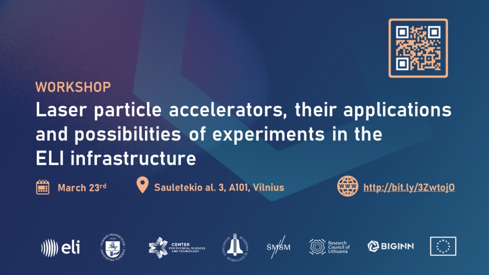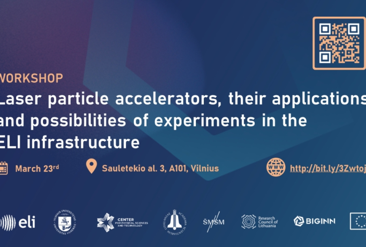 2023 m. kovo 23 d. konferencijų salėje A101 (Fizinių ir technologijos mokslų centras, Saulėtekio al. 3) vyks Ekstremalios šviesos infrastruktūros (Extreme Light Infrastructure, ELI) dirbtuvės "Laser particle accelerators, their applications and possibilities of experiments in the ELI infrastructure".