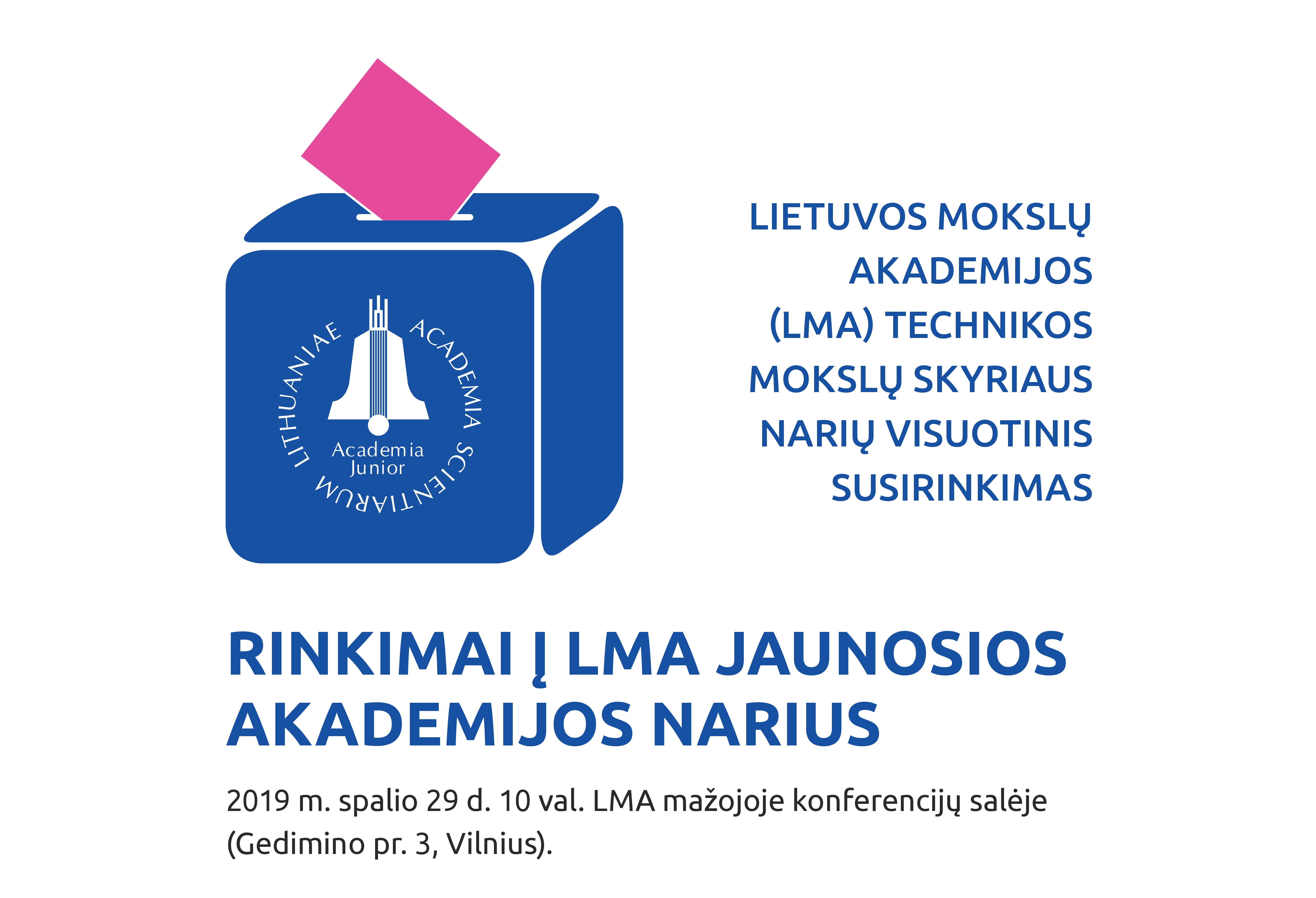 2019 m. spalio 29 d. 10 val. LMA mažojoje konferencijų salėje (Gedimino pr. 3, Vilnius) vyks Technikos mokslų skyriaus narių visuotinis susirinkimas – rinkimai į Lietuvos mokslų akademijos (LMA) Jaunosios akademijos narius.