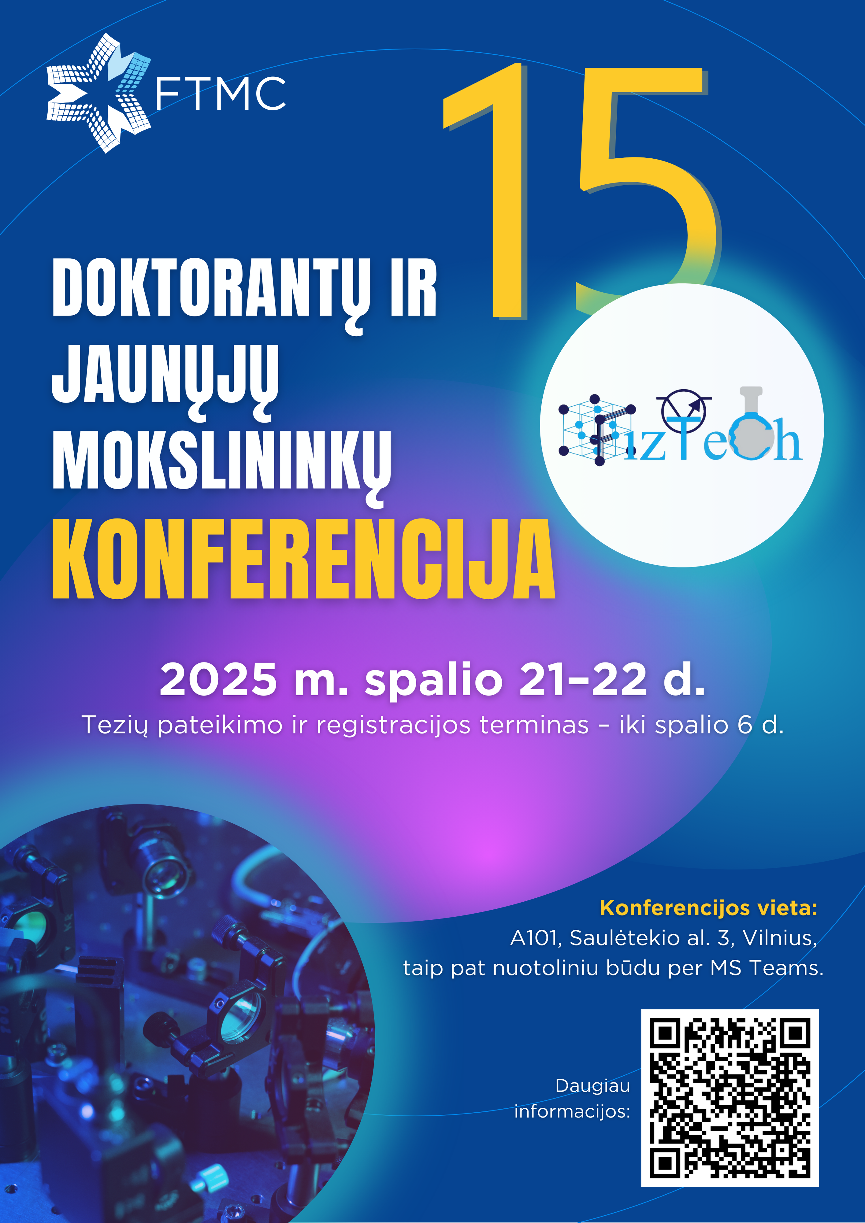 Š. m. spalio 21–22 dienomis vyks Fizinių ir technologijos mokslų centro doktorantų konferencija FizTeCh2025, kurios metu Fizikos, Chemijos bei Medžiagų inžinerijos mokslo krypčių doktorantai pristatys savo atliekamus mokslinius tyrimus, gautus rezultatus ir jų taikymo galimybes. II-rų ir III-čių metų doktorantai (t.y. tie, kas 2024–2025 m.m. studijavo II ir III metus) privalo daryti žodinius pranešimus. Kitų studijų metų doktorantai taip pat gali dalyvauti konferencijoje ir yra labai laukiami. Šiais metais įstoję doktorantai ir bakalauro/magistro studijų studentai gali pristatyti stendinius pranešimus (A1 formato).
