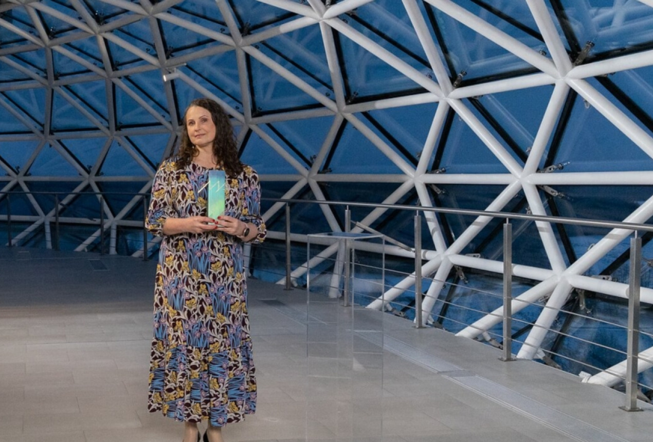 Renatai Butkutei apdovanojimą įteikė komisijos narys Gytis Dudas (Monikos Pau/LRT nuotrauka)