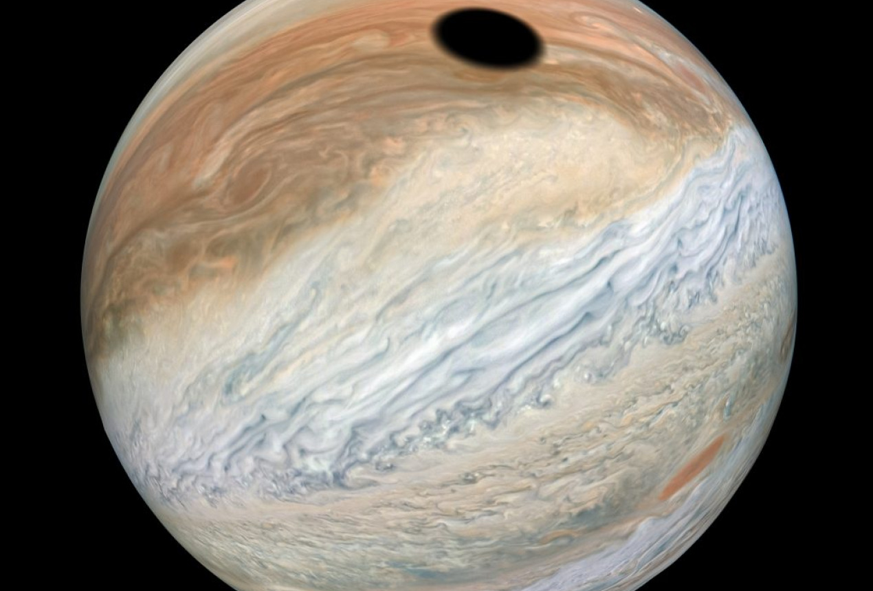 Savaitės paveiksliukas – dar vienas Juno zondo duomenų sudėtas paveikslas. Čia matome palydovo Ijo, dydžiu panašaus į Mėnulį, šešėlį, uždengiantį tik mažą dalį Jupiterio. Kaip visada, Jupiterio debesų juostos atrodo įspūdingai.