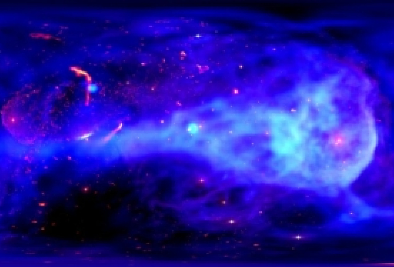 Kaip atrodytų dangus, jei būtų Galaktikos centre? Deja, to pasakyti tiksliai negalime, bet galime pabandyti sumodeliuoti. Pasinaudoję geriausia turima informacija apie medžiagos struktūras ir žvaigždžių padėtis centrinėje Paukščių Tako dalyje, mokslininkai sukūrė šią vizualizaciją. Joje matomas viso dangaus vaizdas, taigi reikėtų įsivaizduoti, kad vaizdas apgaubia jus visiškai. Mėlynai pavaizduotos karščiausios labai retos dujos, raudonai – šaltesni telkiniai, geltonai – pačios šalčiausios ir tankiausios sankaupos.