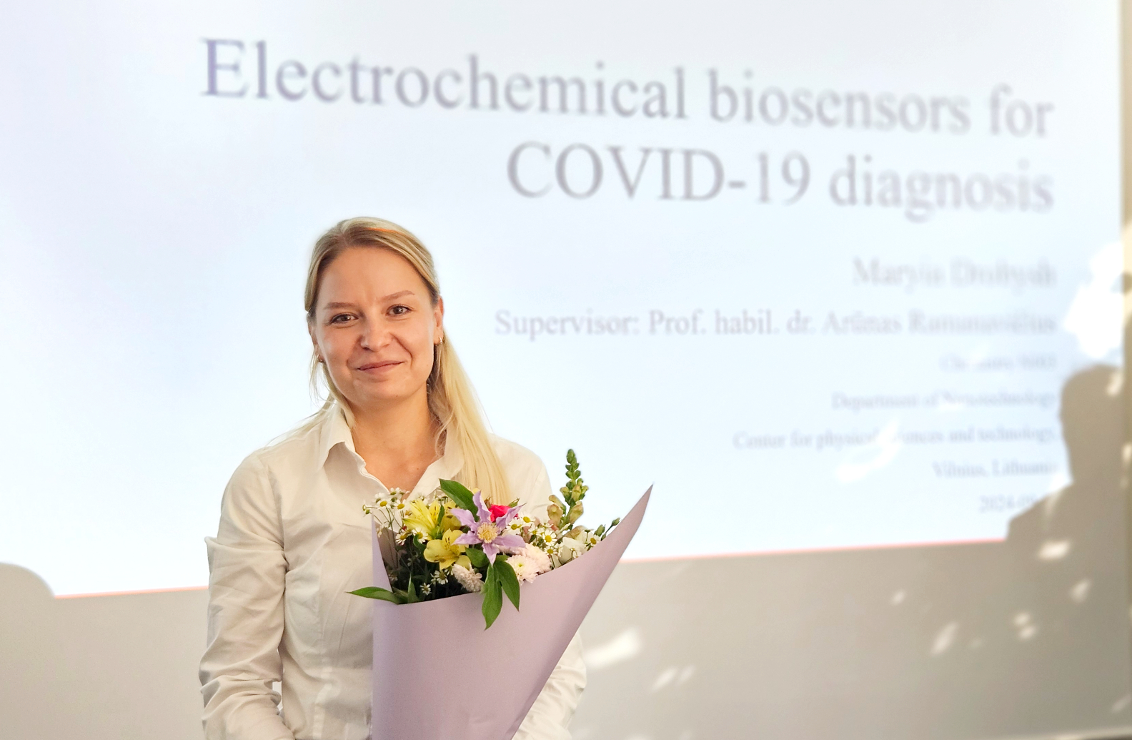 FTMC Nanotechnologijų skyrius turi dar vieną puikius rezultatus demonstruojančią gamtos mokslų daktarę! Šiandien ja tapo Maryia Drobysh, apgynusi disertaciją „Elektrocheminiai biojutikliai COVID-19 diagnostikai“ (mokslinis vadovas: prof. habil. dr. Arūnas Ramanavičius).
