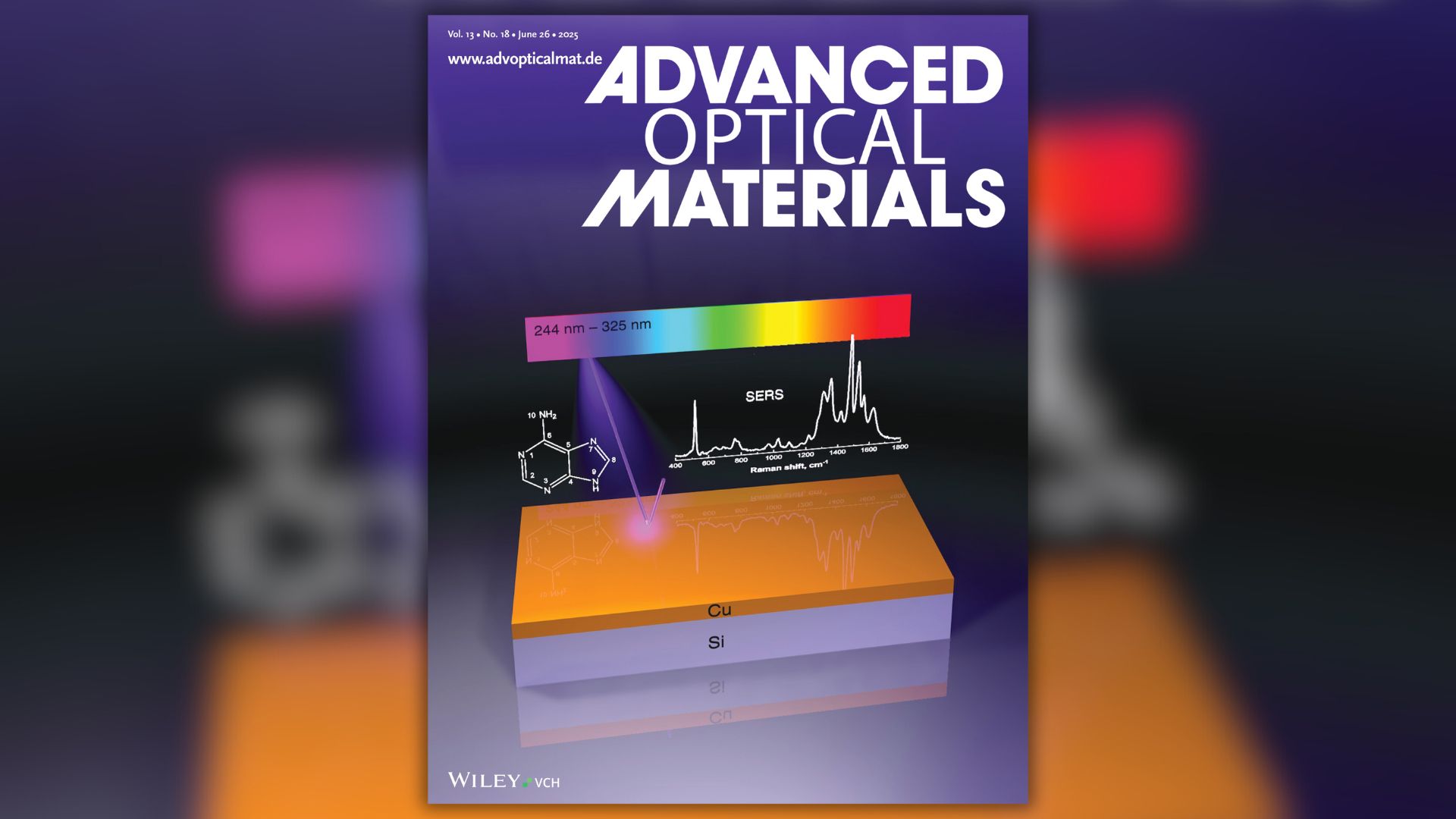 Kaip tai atrodo praktiškai? Pažvelkime į „Advanced Optical Materials“ galinį viršelį: apačioje matome silicio padėklą, ant kurio pritvirtintos vario nanodalelės. Paviršius atrodo lygus, nors, jei vaizdą priartintume mikroskopu, išvystume daugybę „kalnelių“. Viršuje – UV lazerio spindulys, nukreiptas į varį. O viduryje matome adenino molekulės struktūrinę formulę ir SERS signalo duomenis.