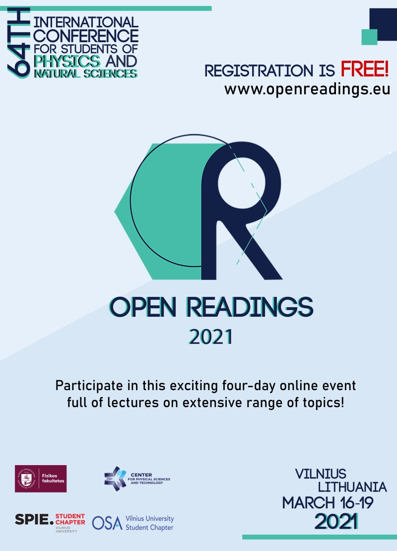 Kviečiame Jus į 64-ąją tarptautinę fizinių bei gamtos mokslų studentų ir jaunųjų mokslininkų konferenciją „Open Readings 2021”, vyksiančią 2021 m. kovo 16-19 d.