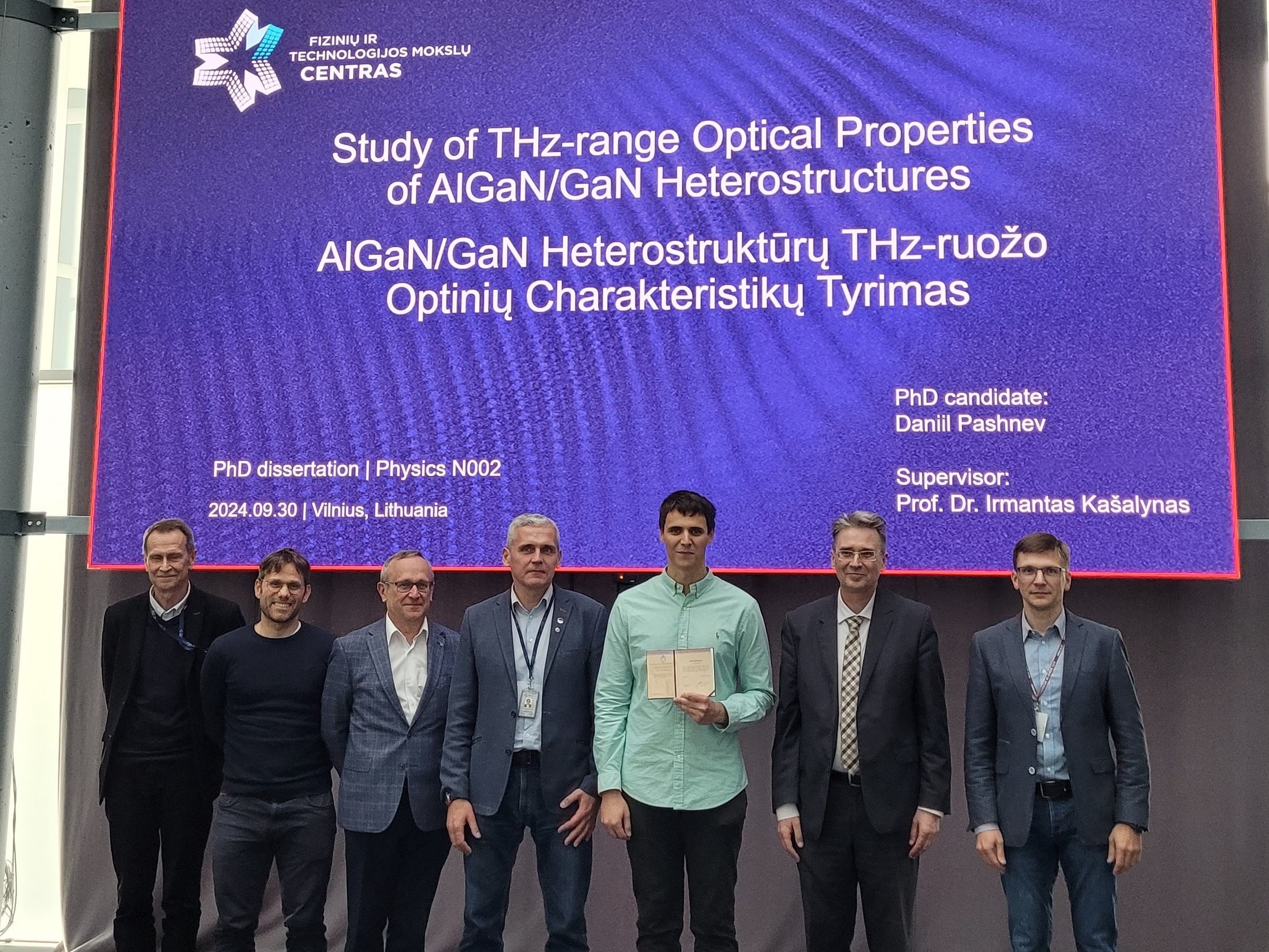FTMC Optoelektronikos skyriaus fizikui Daniilui Pashnevui suteiktas gamtos mokslų daktaro laipsnis. Jis apgynė disertaciją tema „AlGaN/GaN heterostruktūrų THz-ruožo optinių charakteristikų tyrimas“ (mokslinis vadovas dr. Irmantas Kašalynas).