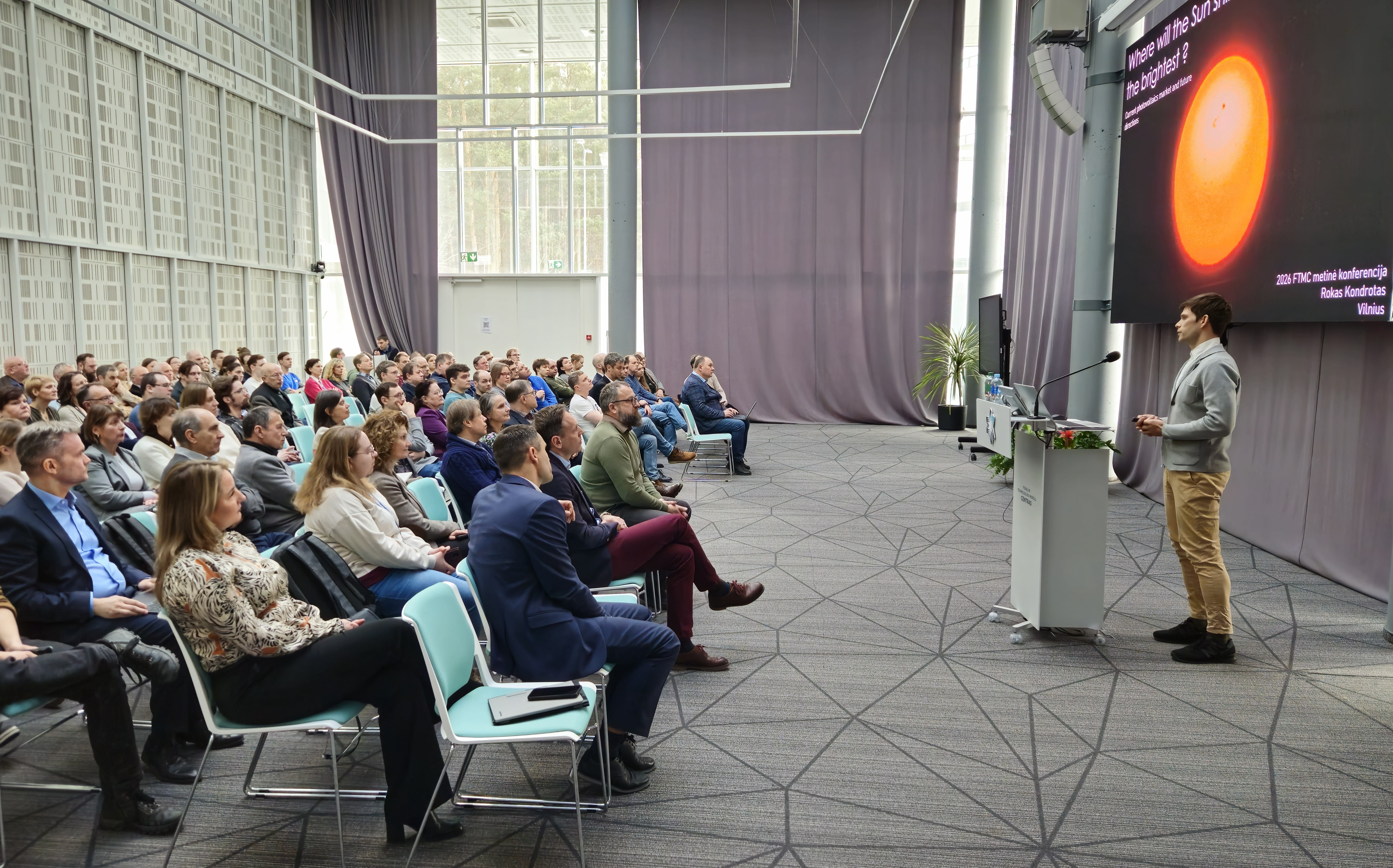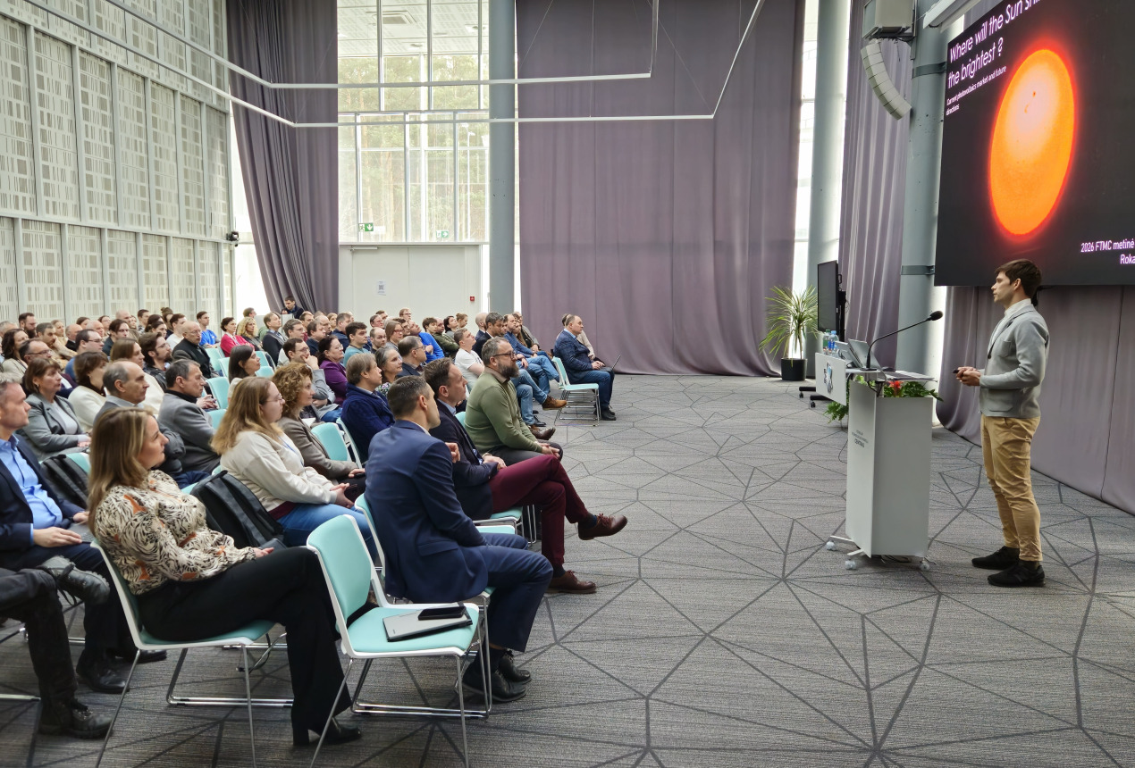 „Kur saulė švies stipriausiai? Dabartinė fotovoltaikos rinka ir ateities perspektyvos“ – antrasis konferencijos pranešimas, kurį skaitė FTMC Medžiagų struktūrinės analizės skyriaus vadovas dr. Rokas Kondrotas. Fotovoltaika yra technologijos, kurios saulės šviesą paverčia į elektros energiją. Pasak mokslininko, šiuo metu visame pasaulyje elektros poreikis sparčiai auga, tačiau pasiūla niekaip nepasiveja paklausos. Todėl saulės elementų efektyvumo didinimas yra viena iš pagrindinių priemonių, kaip patenkinti šį svarbų žmonijos poreikį.