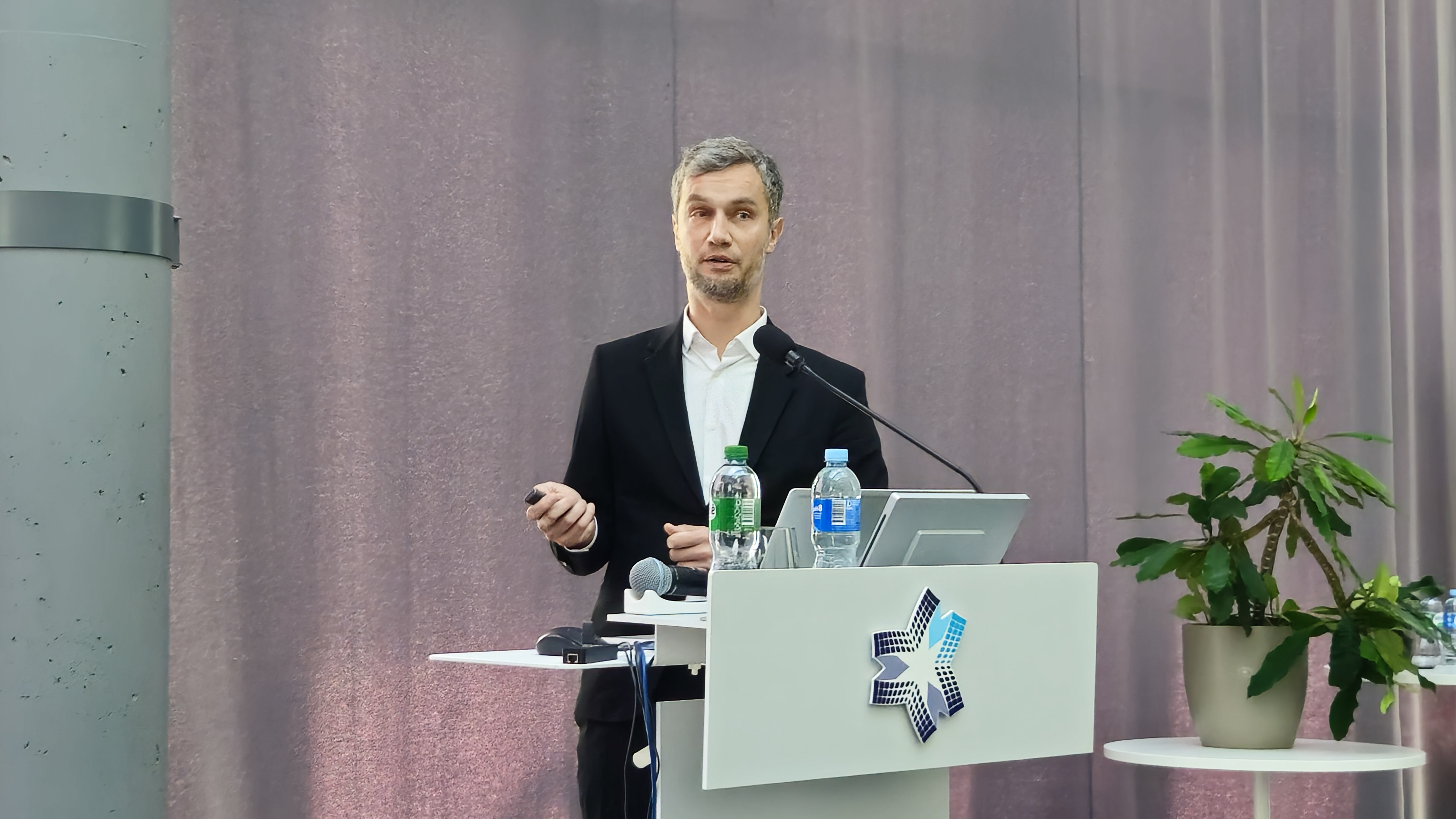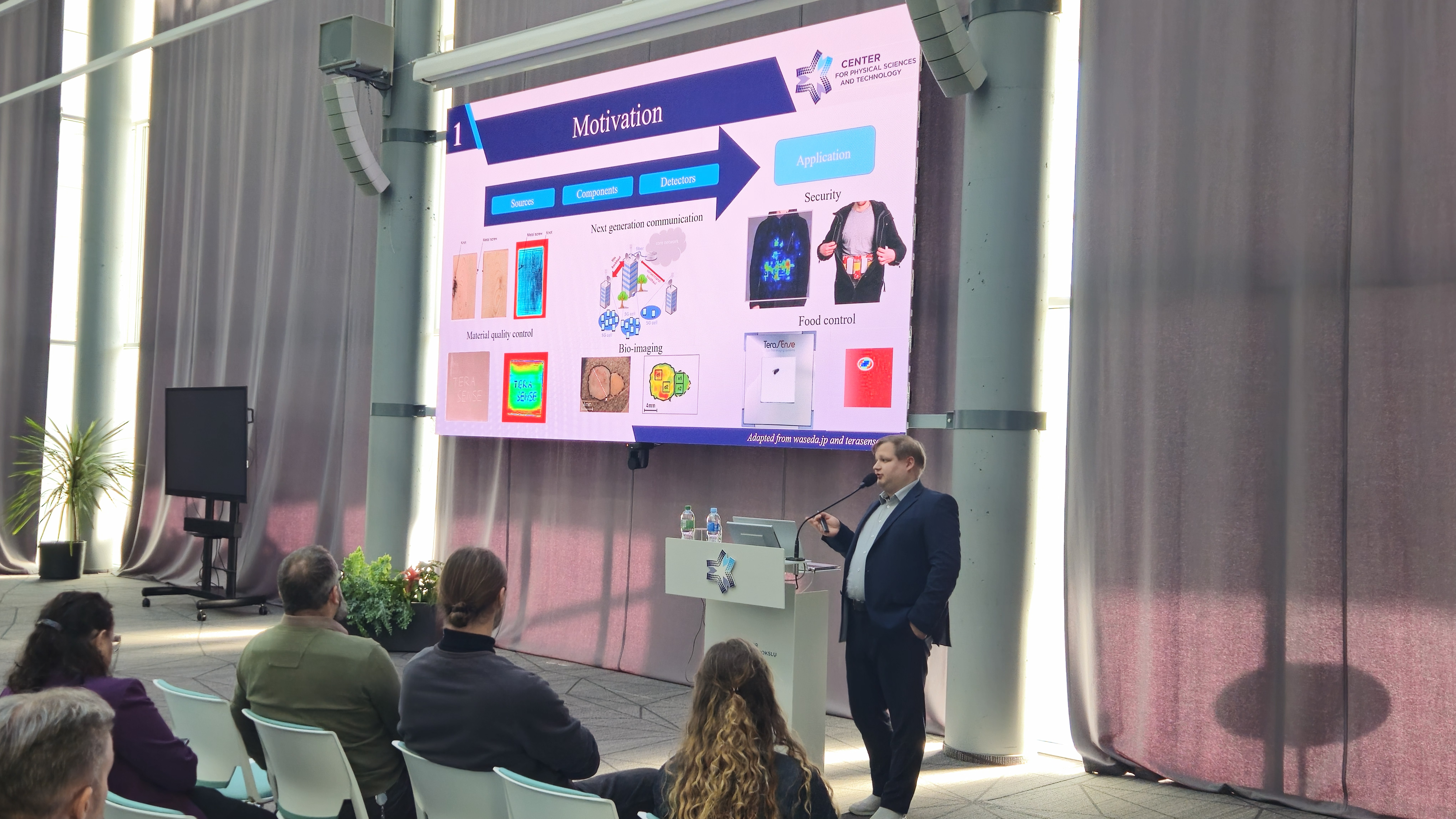 Po jo sekė dr. Vladislovas Čižas, neseniai pelnęs Geriausios 2024 m. disertacijos apdovanojimą Gamtos, technologijos, medicinos ir sveikatos bei žemės ūkio mokslų srities kategorijoje. Jo pranešimas ir buvo ta pačia tema – „Aukšto dažnio parametrinės ir Bloch stiprinimo perspektyvos GaAs/AlGaAs supergardelėse“.