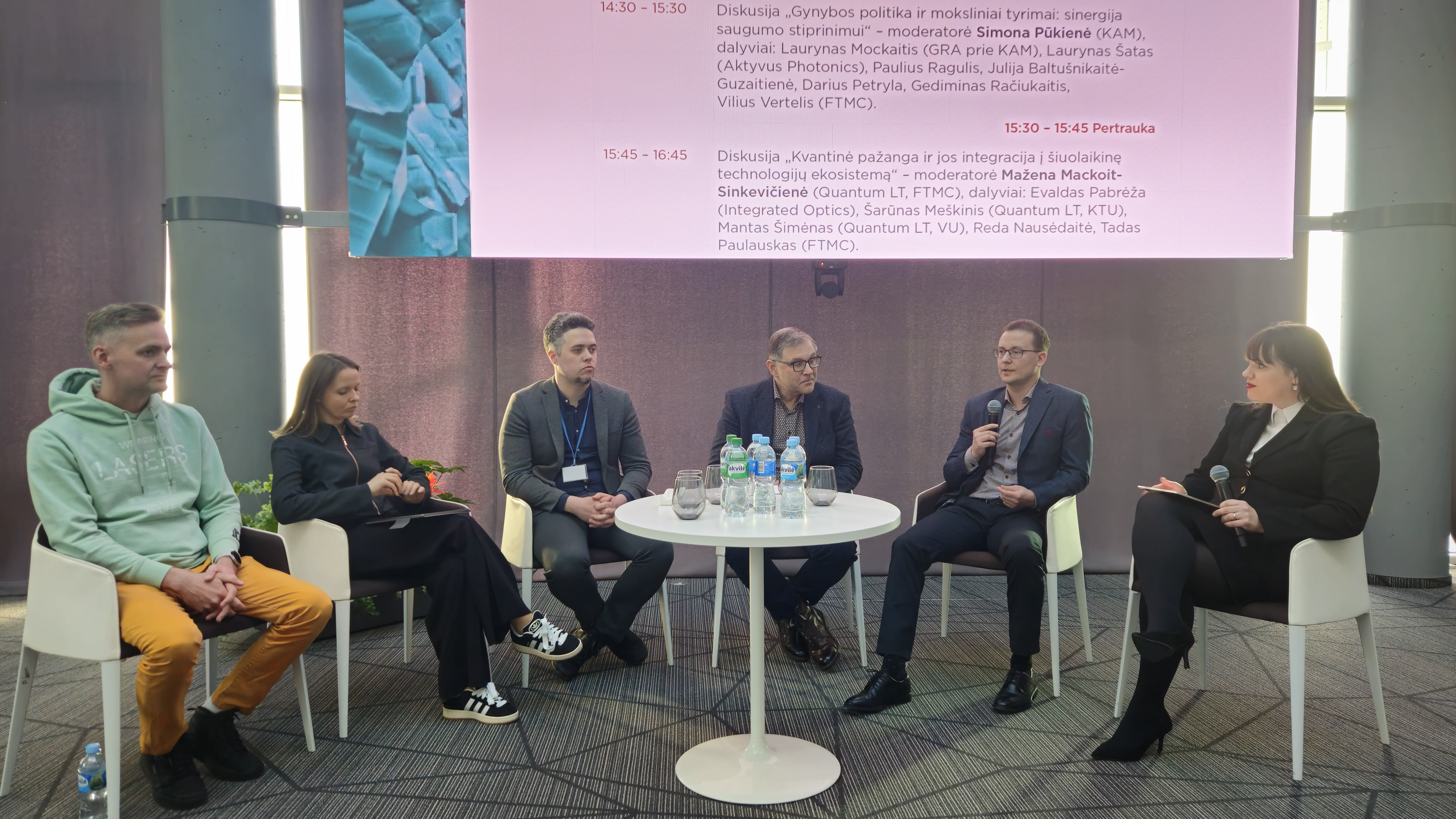 Po pranešimų sekė diskusijos aktualiomis temomis. Pirmoji – „Gynybos politika ir moksliniai tyrimai: sinergija saugumo stiprinimui“. Savo įžvalgomis dalijosi Gynybos resursų agentūros prie Krašto apsaugos ministerijos (KAM) atstovas Laurynas Mockaitis, FTMC direktoriaus patarėjas Darius Petryla ir FTMC mokslininkai: dr. Paulius Ragulis, dr. Julija Baltušnikaitė-Guzaitienė, dr. Gediminas Račiukaitis ir dr. Vilius Vertelis. Diskusiją moderavo KAM atstovė dr. Simona Pūkienė.