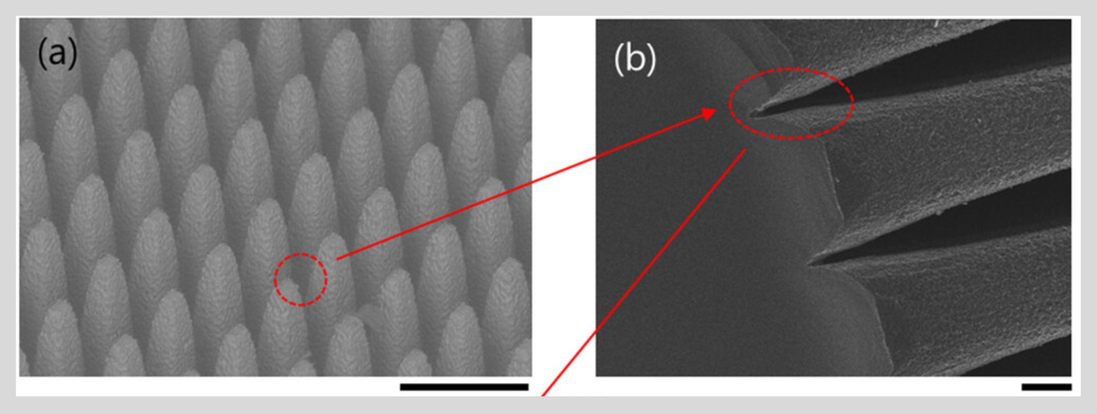 (Scanning Electron Microscope (SEM) images of the moth-eye/PyC structure at different magnifications. For comparison: (a) shows an area about a thousand times smaller than the width of a human hair, and (b) about five thousand times smaller. Photos: FTMC)