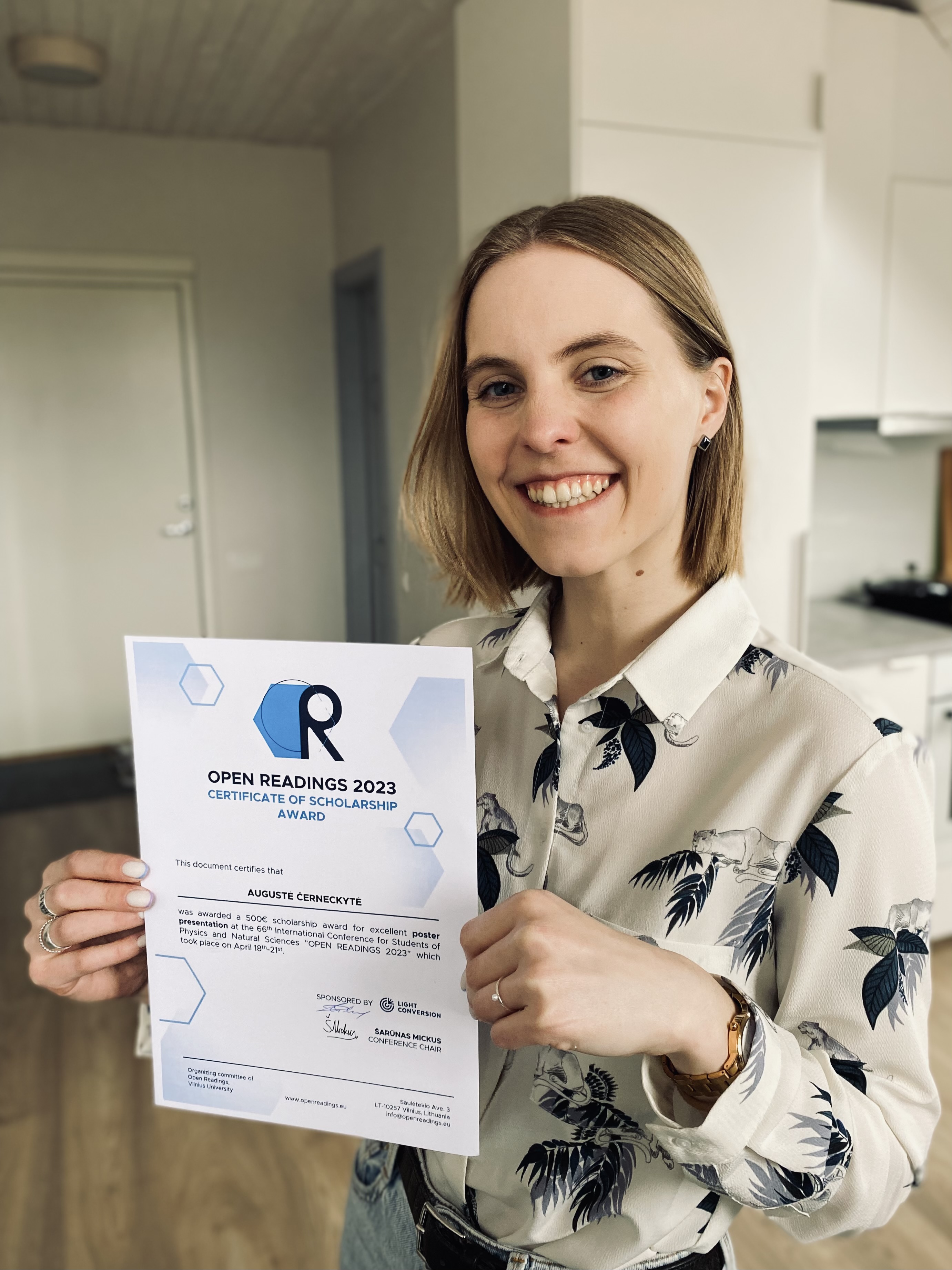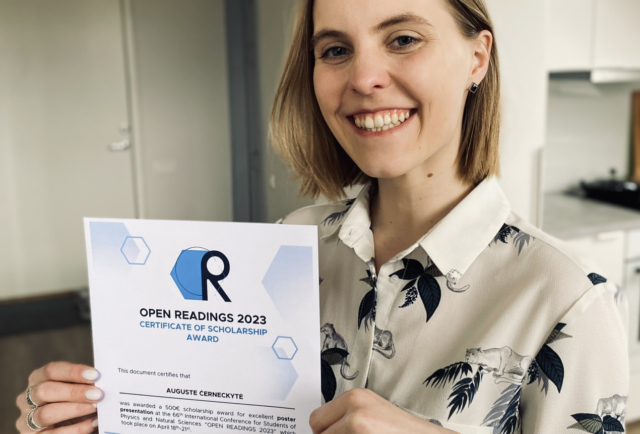 Augustė had the opportunity to present her work publicly at the international conference for students and young scientists Open Readings 2023, which took place on 18-21 April at FTMC building. At the end of the event, two authors of poster and oral presentations were awarded the Prof. Piskarskas Award for the best presentations on photonics and laser technologies (sponsored by Light Conversion).