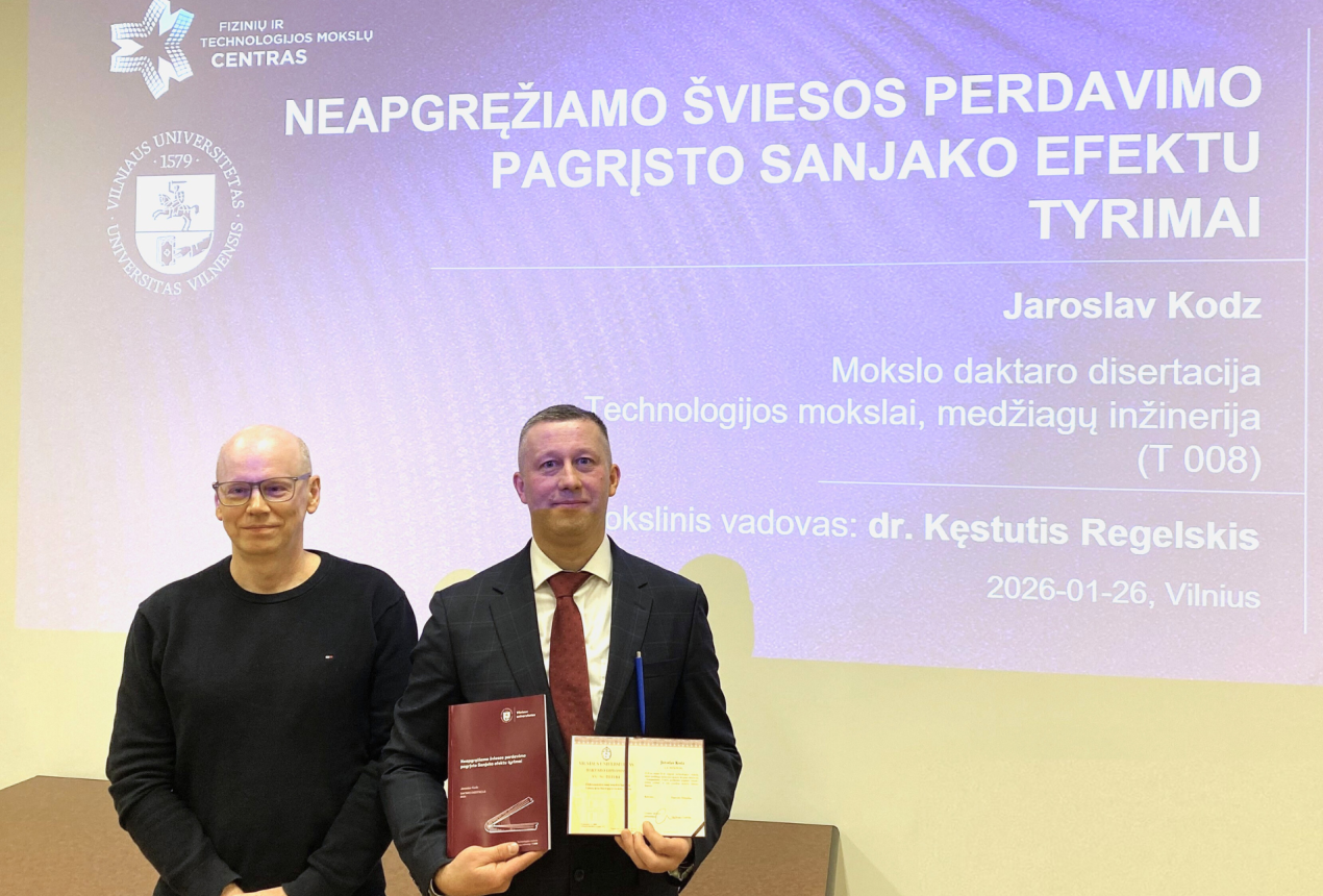 On 26 January, physicist Dr Jaroslav Kodz from the FTMC Department of Laser Technologies successfully defended his doctoral dissertation. The title of his thesis is “Research on Non-Reciprocal Light Transmission Based on the Sagnac Effect” (academic supervisor: Dr Kęstutis Regelskis).