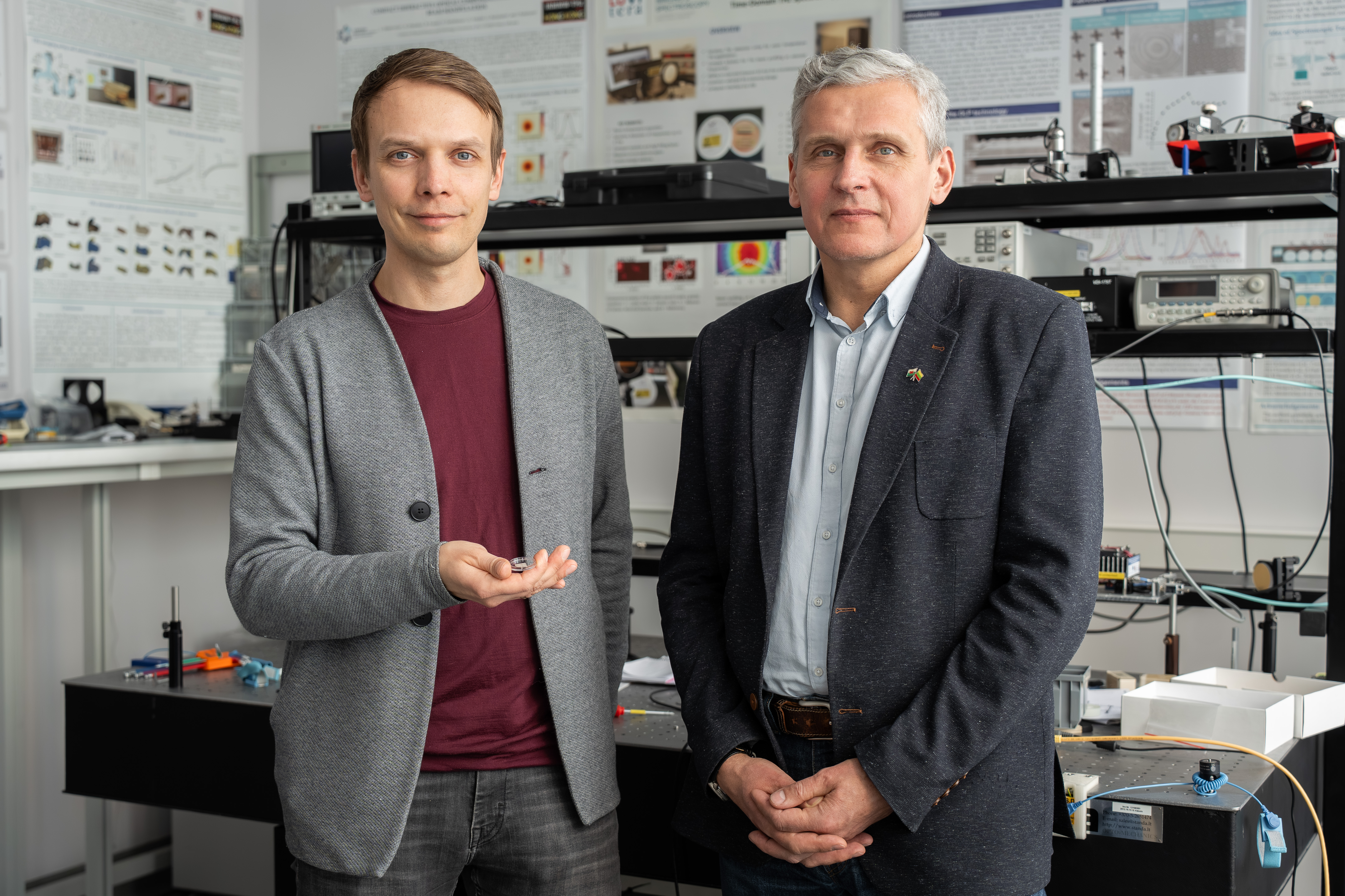One of the biggest joys in a scientific career is the moment when your discoveries turn into real, functioning devices. A recent example is a spectrally selective, directional thermal electromagnetic radiation emitter, patented in 2025 by physicists Dr Irmantas Kašalynas and Dr Vytautas Janonis from the FTMC Department of Optoelectronics.