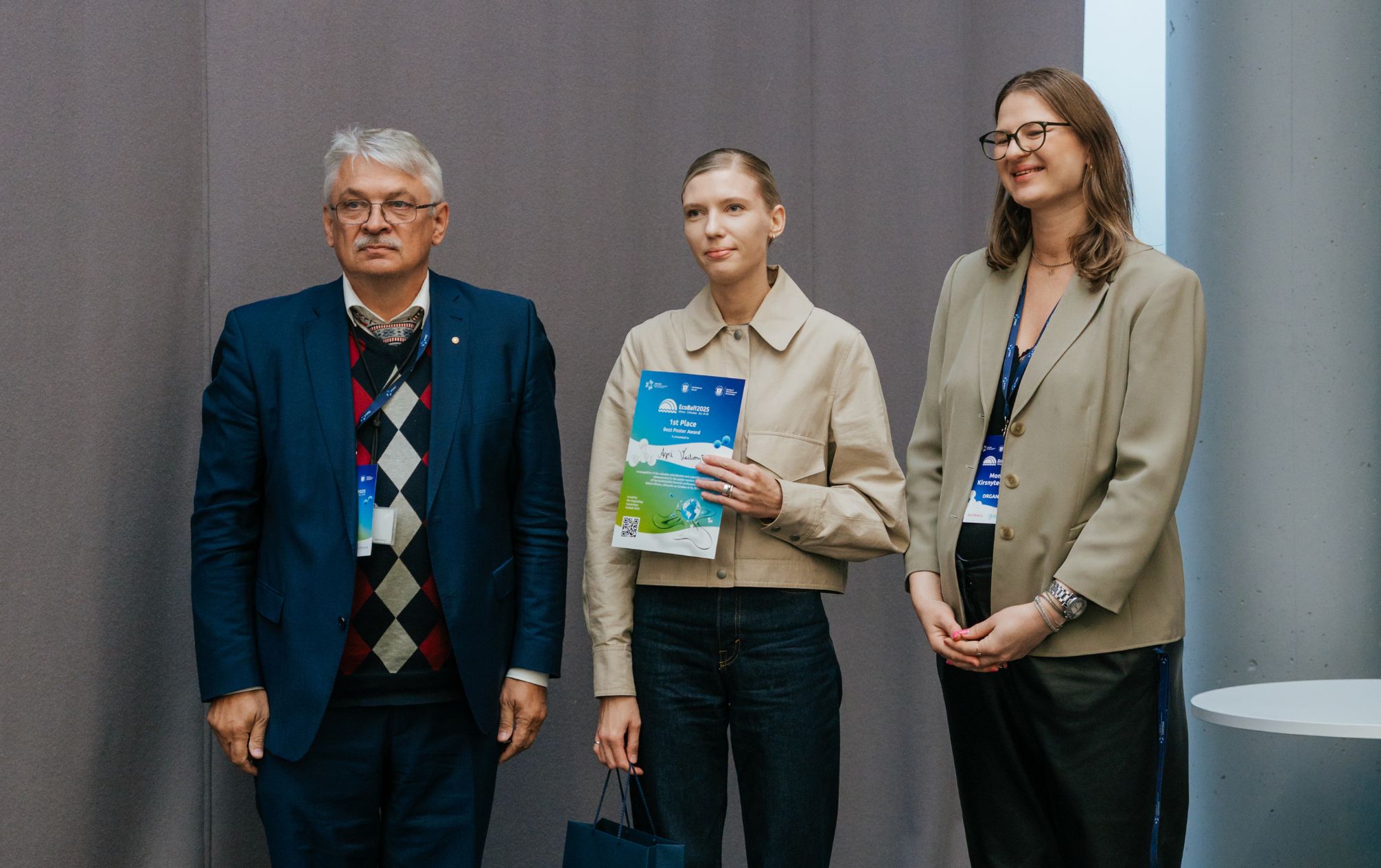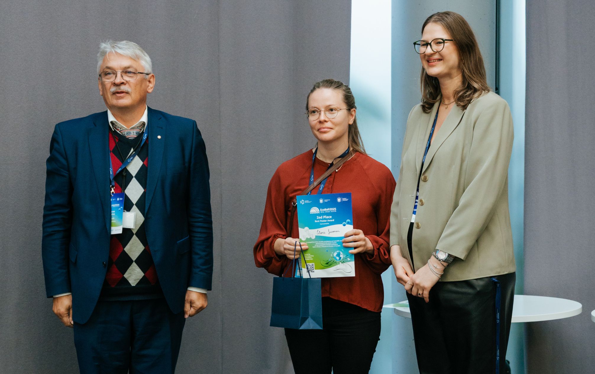 (Professor habil. Dr. Aivaras Kareiva, Chair of the Scientific Committee of “EcoBalt 2025”, Ilona Juvonen, winner of the 2nd place in the poster presentation category, and Dr. Monika Kirsnytė-Šniokė, member of the “EcoBalt 2025” Organizing Committee. Photo: Judita Vadeikė / FTMC)