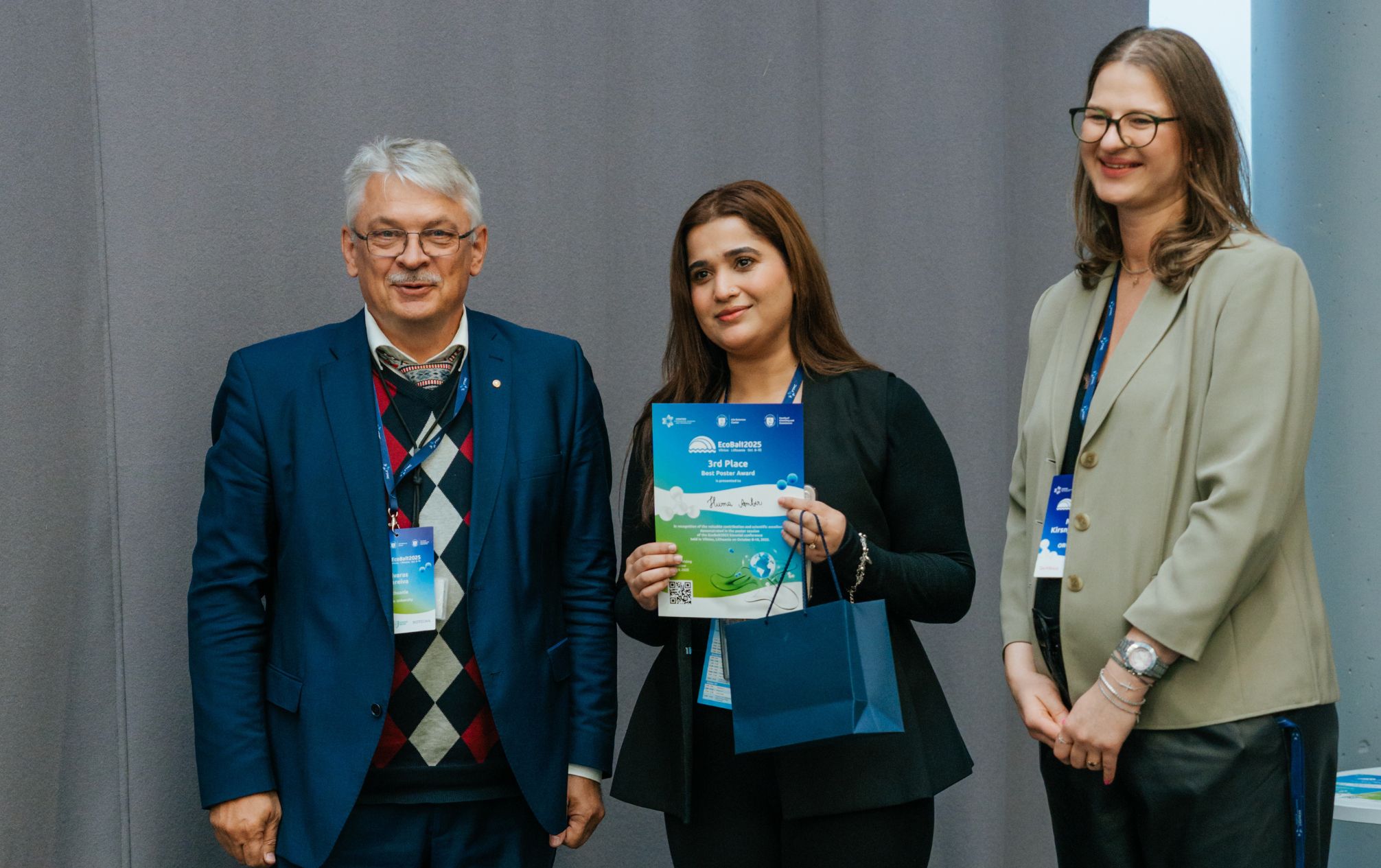 (Professor habil. Dr. Aivaras Kareiva, Chair of the Scientific Committee of “EcoBalt 2025”, Huma Amber, winner of the 3rd place in the poster presentation category, and Dr. Monika Kirsnytė-Šniokė, member of the “EcoBalt 2025” Organizing Committee. Photo: Judita Vadeikė / FTMC)