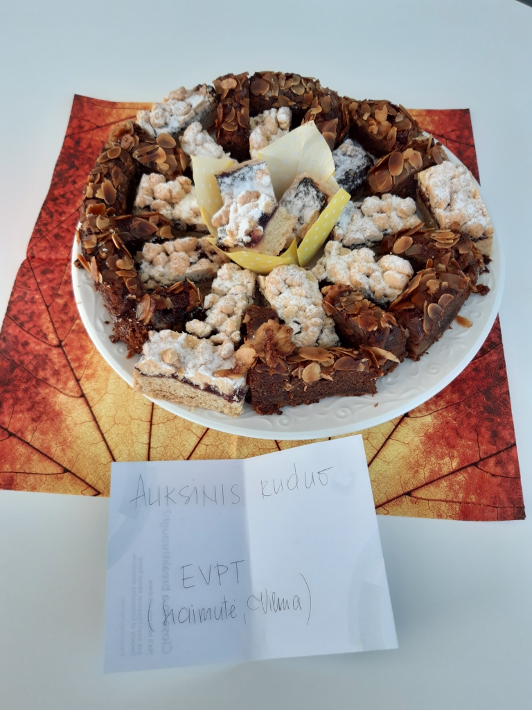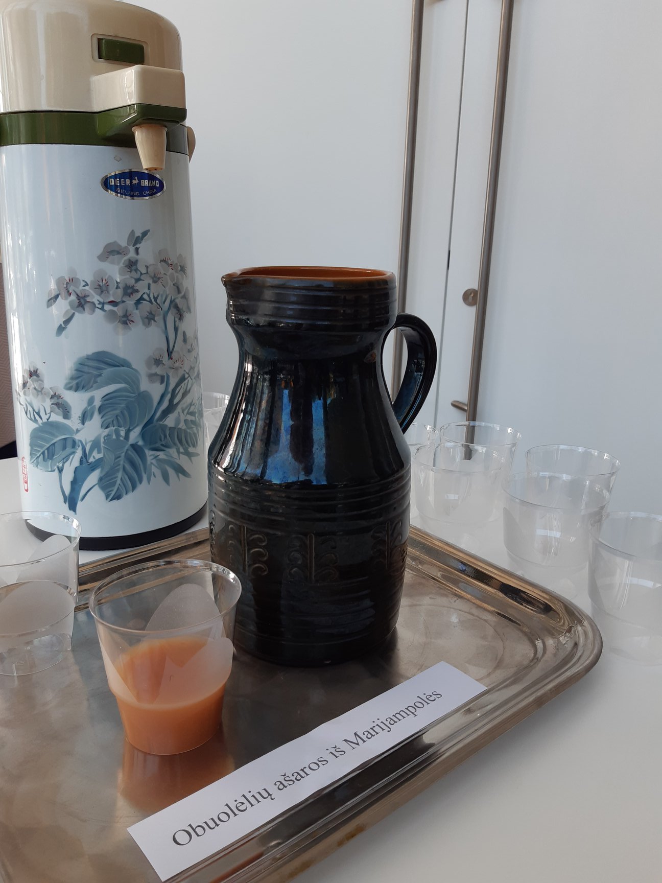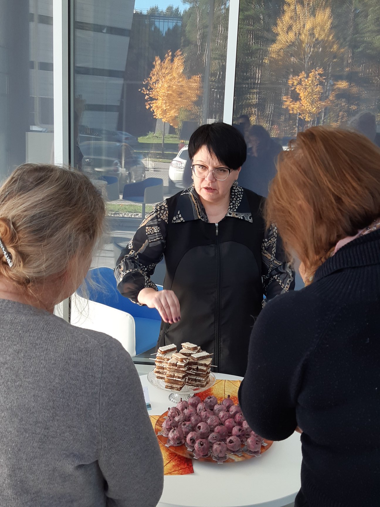 Parodoje – degustacijoje prie kartu su kolegomis suruošto bendro stalo vaišinomės kvapniais, gardžiais obuolių pyragais, aromatingais obuolių sūriais. Stiprinome imunitetą vitamino C „užtaisu“ - svarainiais, spalvingomis salotomis, obuolių sultimis „Obuolėlių ašaros iš Marijampolės“.