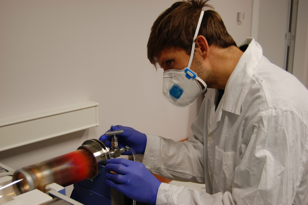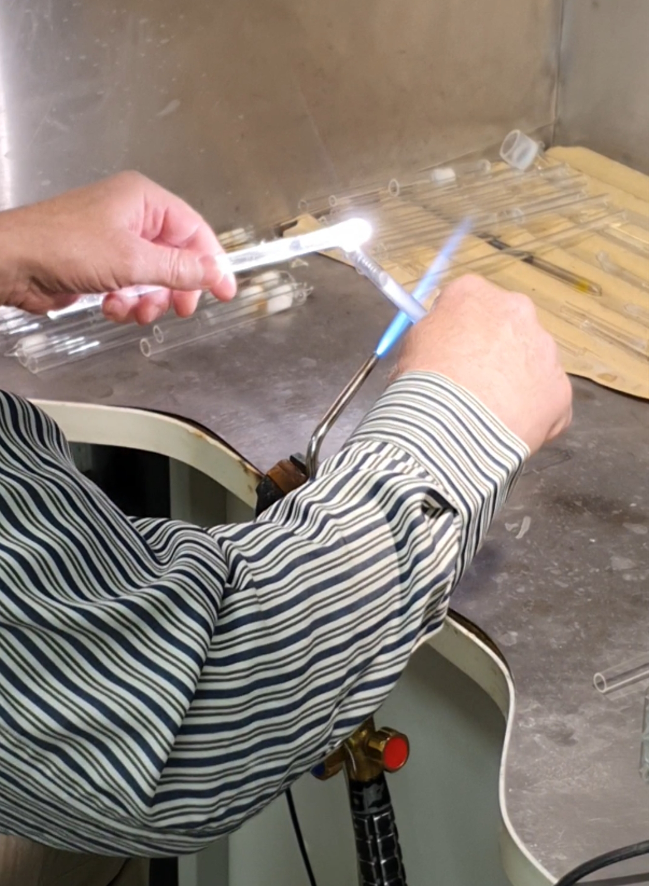 Stiklapūčiu užlydomas vienas kvarcinės ampulės galas, sudedami bandiniai ir kapsulė užlydoma. Talino technikos universiteto laboratorija (asmeninio archyvo nuotrauka)