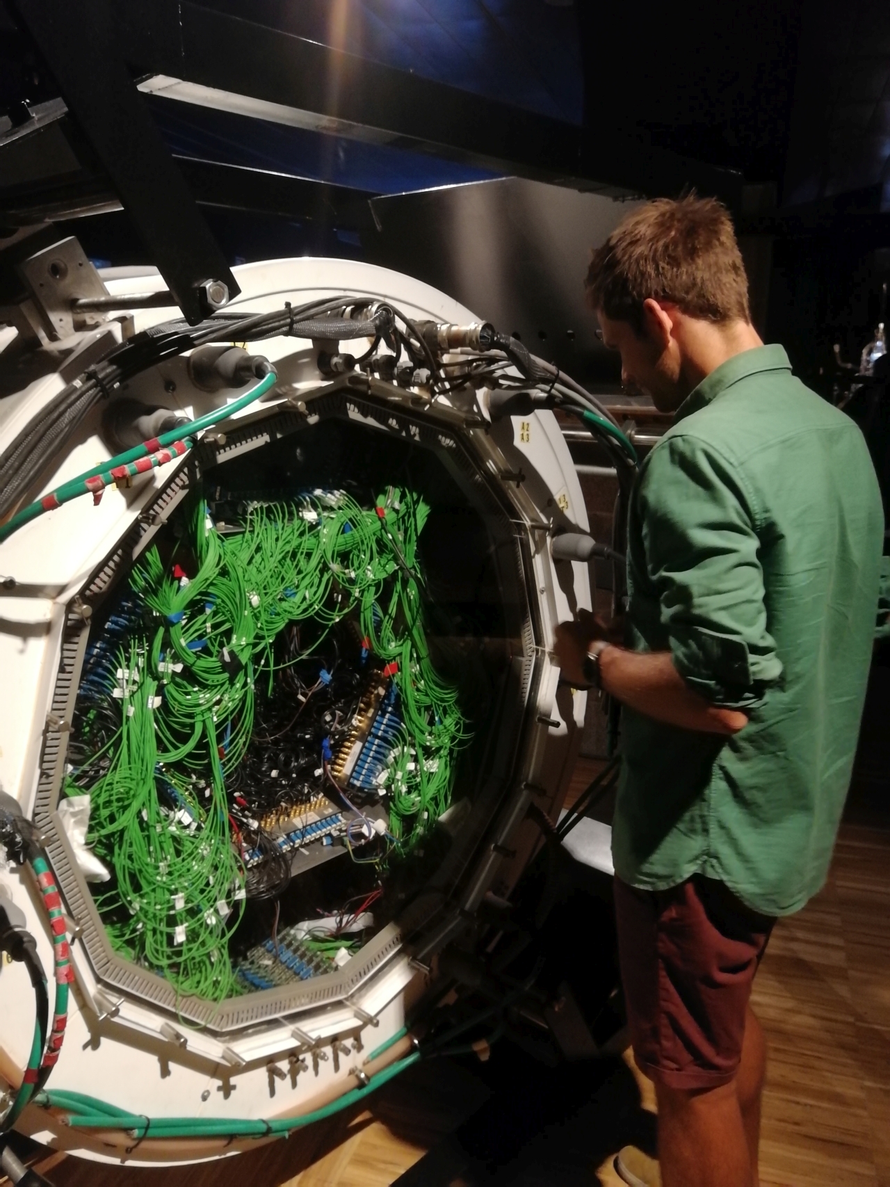 Greta vieno iš nebenaudojamų CERN detektorių, eksponuojamų šiuolaikinės kultūros centre, Barselonoje (asmeninio archyvo nuotrauka)