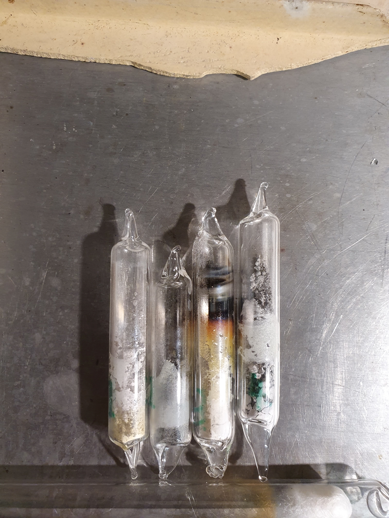 Kvarco ampulės su jose užlydytomis medžiagomis, skirtomis perovskitinių chalkogenidų sintezei - Talino technikos niversiteto Fotovoltaikos laboratorija (asmeninio archyvo nuotrauka)