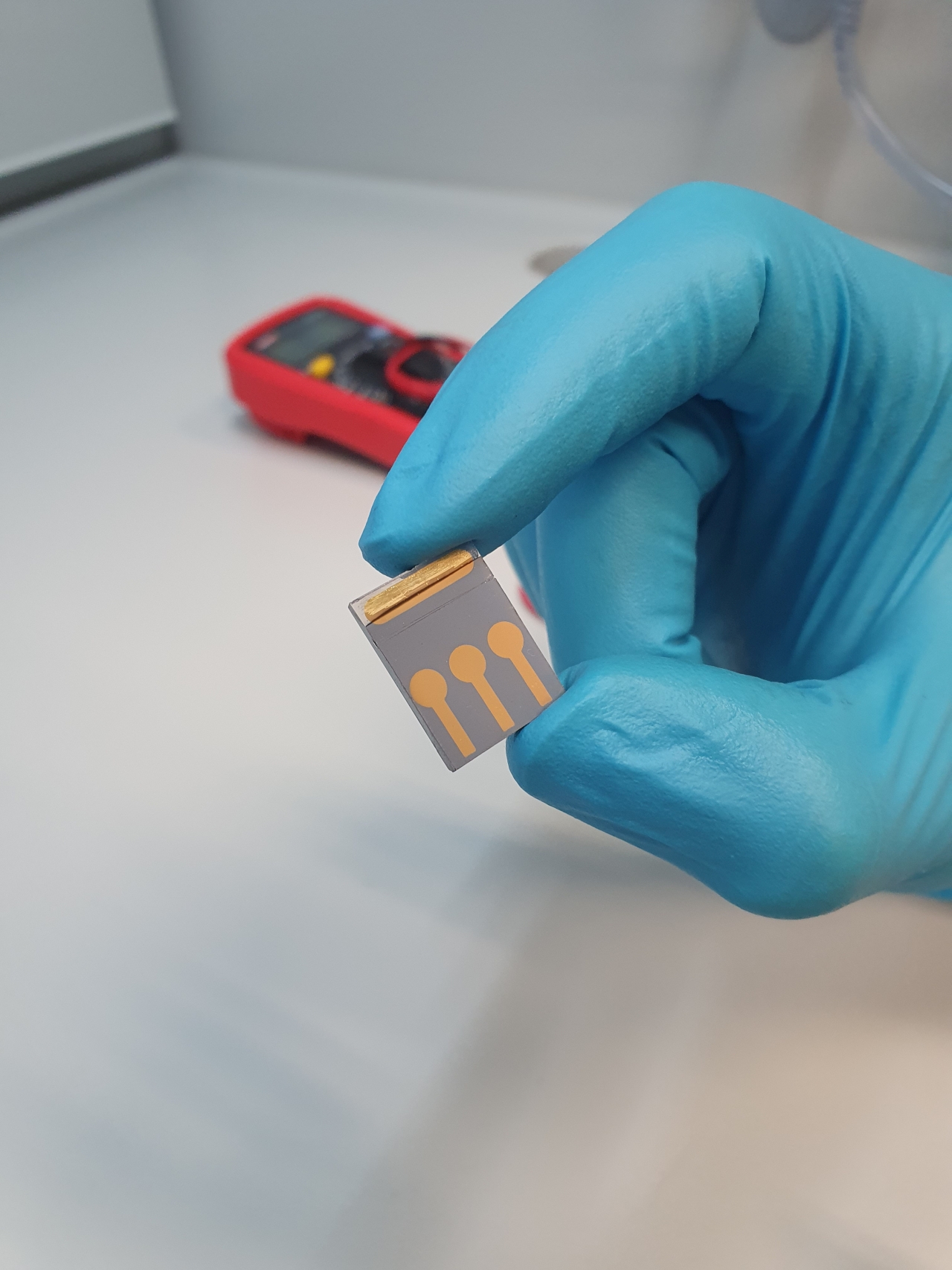 Stibio selenido saulės elementas su aukso kontaktais FTMC Medžiagų struktūrinės analizės skyriaus laboratorijoje (asmeninio archyvo nuotrauka)
