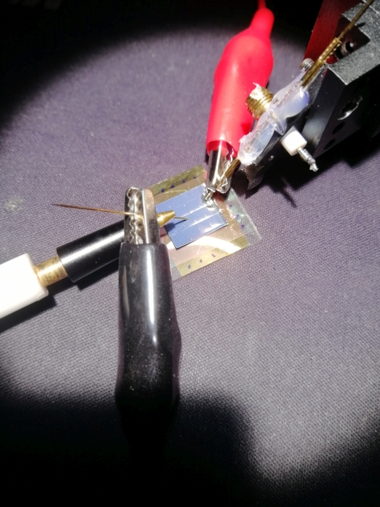 Prijungti prie lankstaus saulės elemento zondai. Jų pagalba matuojamos elemento elektrinės charakteristikos, esant dirbtiniam saulės apšvietimui. Uhano nacionalinė optoelektronikos prof. J. Tang laboratorija (asmeninio archyvo nuotrauka)