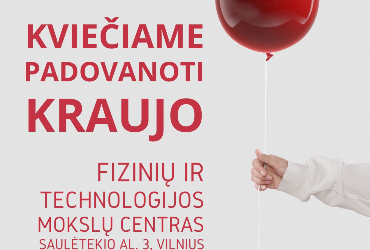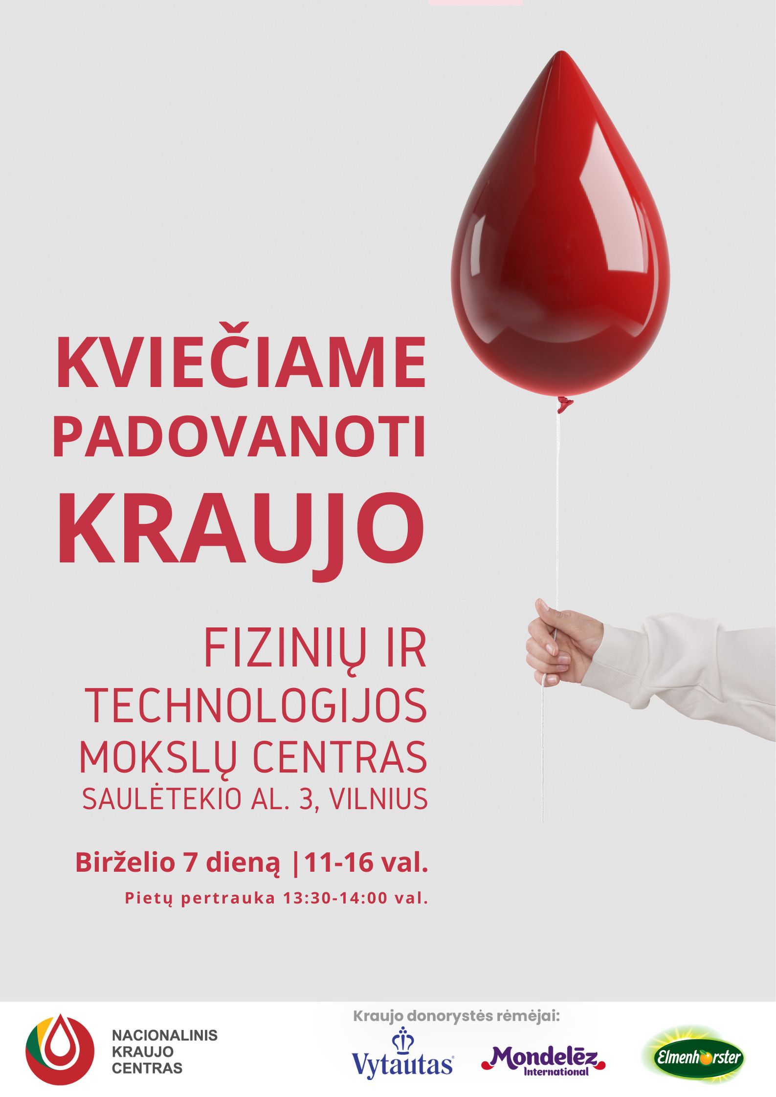Nacionalinis kraujo centras maloniai kviečia Jus į kraujo donorystės akciją, kuri vyks Fizinių ir technologijos mokslų centre (Saulėtekio al. 3, Vilnius) 2022 m. birželio 7 d. (antradienį) nuo 11 iki 16 val.