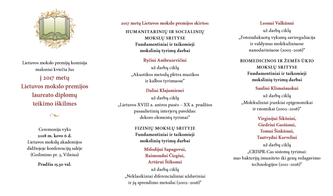 2018 m. kovo 6 d. 15.30 val. Lietuvos mokslų akademijos didžiojoje konferencijų salėje (Gedimino pr. 3, Vilnius) vyks 2017 metų Lietuvos mokslo premijos laureato diplomų teikimo iškilmės.