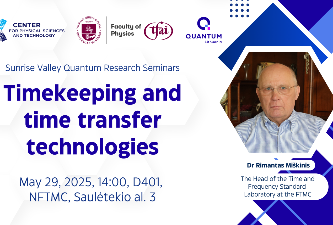 FTMC kartu su Vilniaus universitetu kviečia į seminarą „Laiko matavimo ir perdavimo technologijos“, kuris vyks gegužės 29 d. 14:00 val. NFTMC D401 auditorijoje.