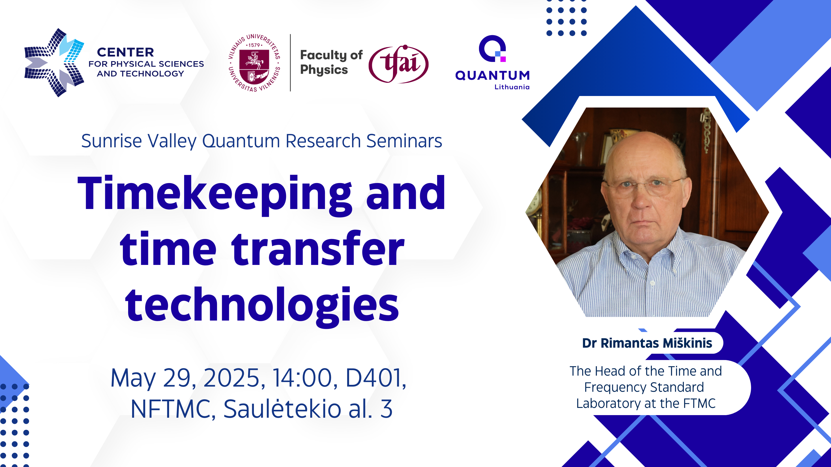 Seminarą ves Laiko ir dažnio etalono laboratorijos vadovas Rimantas Miškinis, kuris pasidalins žiniomis apie tai, kaip tikslus laiko matavimas yra būtinas šiuolaikinės visuomenės infrastruktūrai – nuo GPS iki finansinių sistemų.