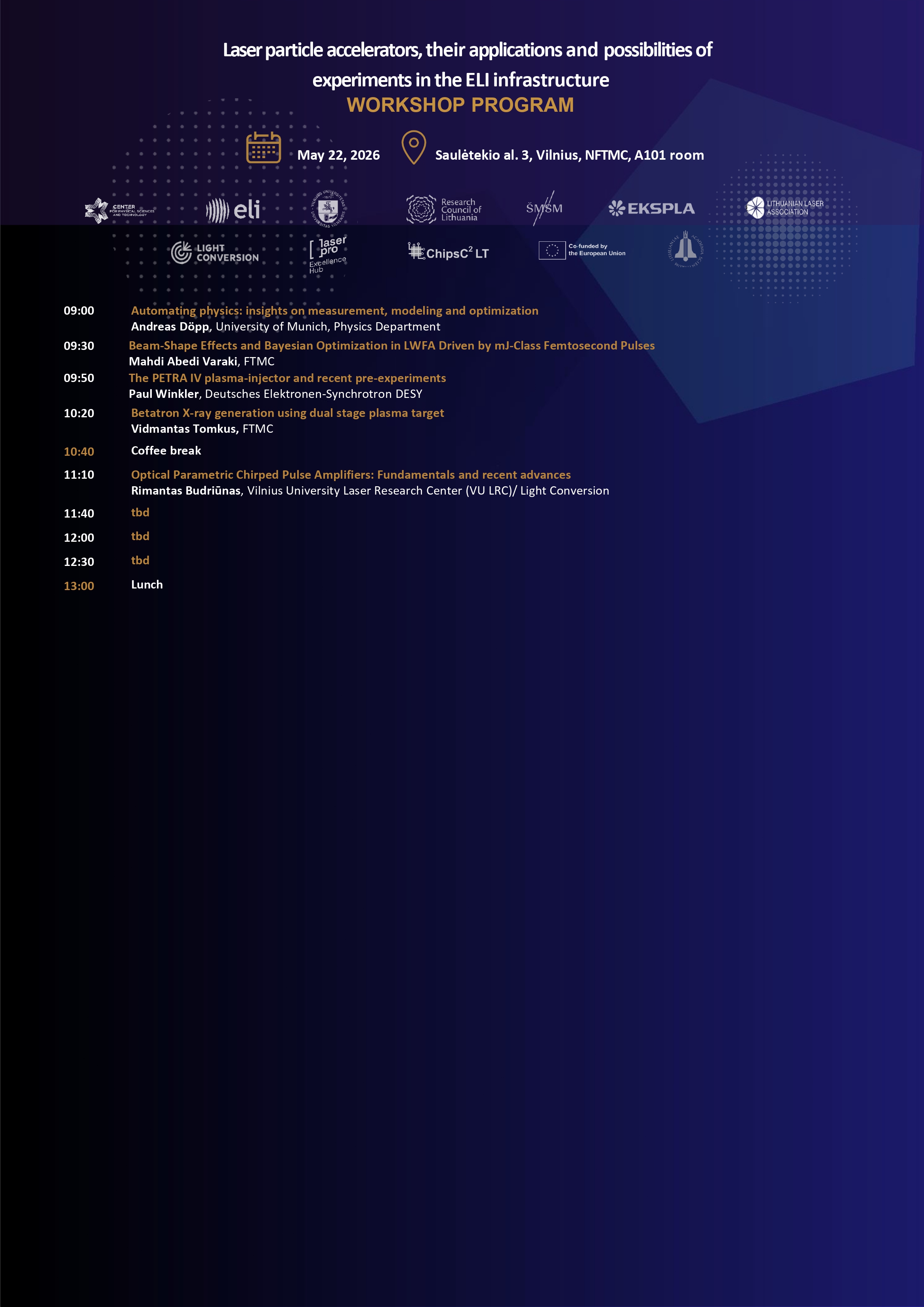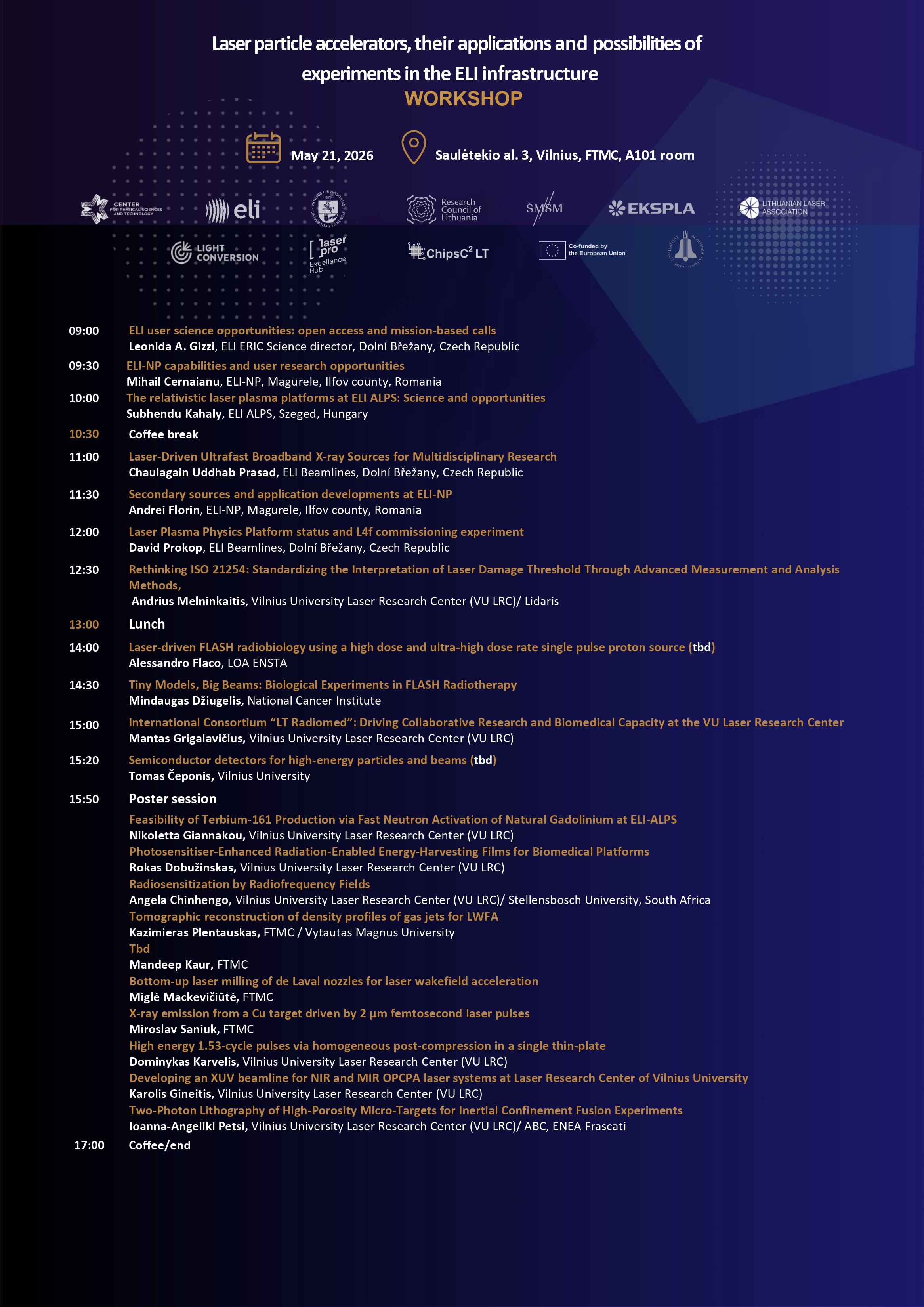 Ši dviejų dienų konferencija – unikali proga susipažinti su naujausiais Extreme Light Infrastructure (ELI) mokslo centre vykdomais tyrimais, atviros prieigos galimybėmis bei pažangiausiomis lazerių plazmos technologijomis. Renginys skirtas mokslininkams, doktorantams, inžinieriams ir visiems, besidomintiems ultrasparčiųjų lazerių šaltiniais, radiacijos poveikiu biologinėms sistemoms, dalelių greitinimo lazeriu naujovėmis bei dirbtinio intelekto taikymu fizikiniuose eksperimentuose.