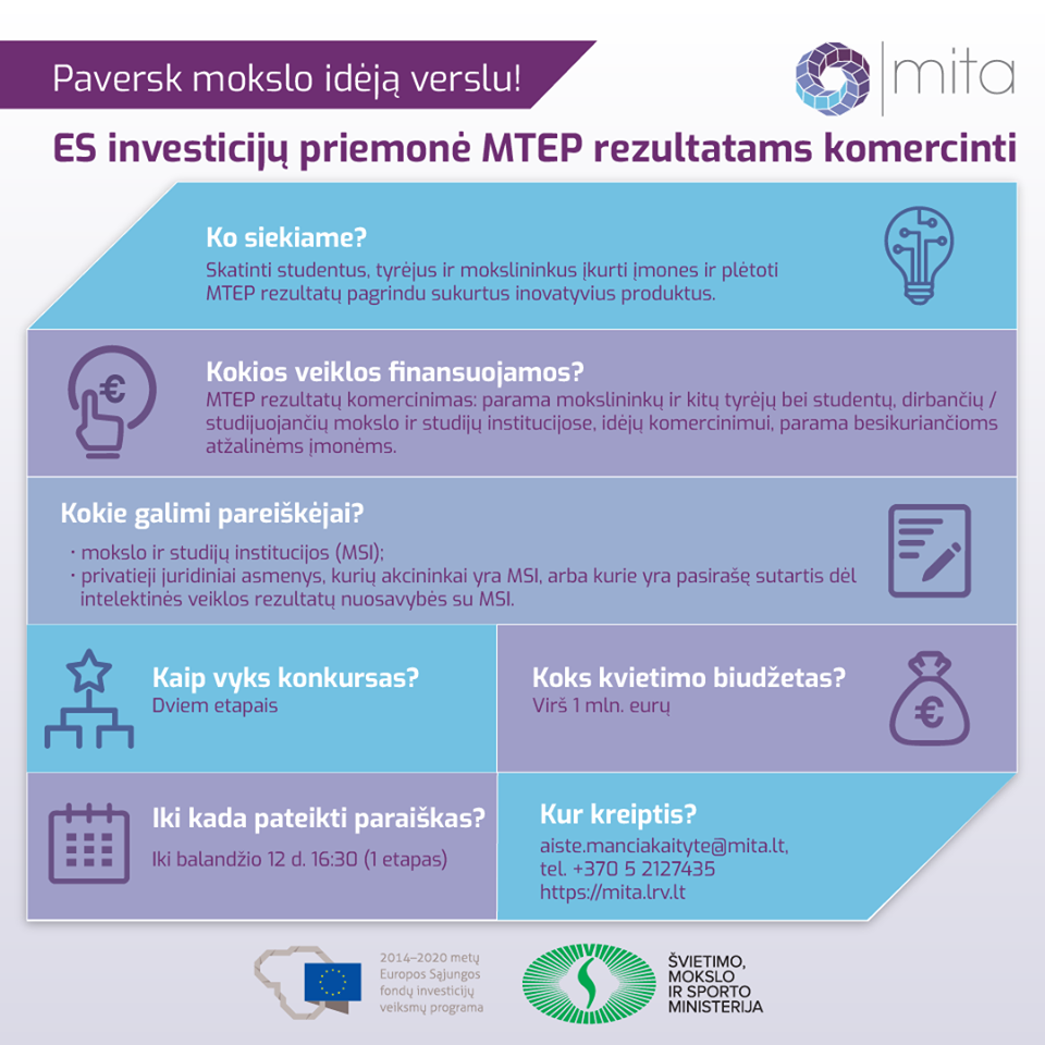 Mokslo, inovacijų ir technologijų agentūra (MITA) kartu su Švietimo, mokslo ir sporto ministerija kviečia mokslininkus, tyrėjus ir studentus dalyvauti konkurse su naujomis verslo idėjomis, kurių pagrindu būtų kuriamos mokslui imlios, atžalinės įmonės (angl. spin-off).