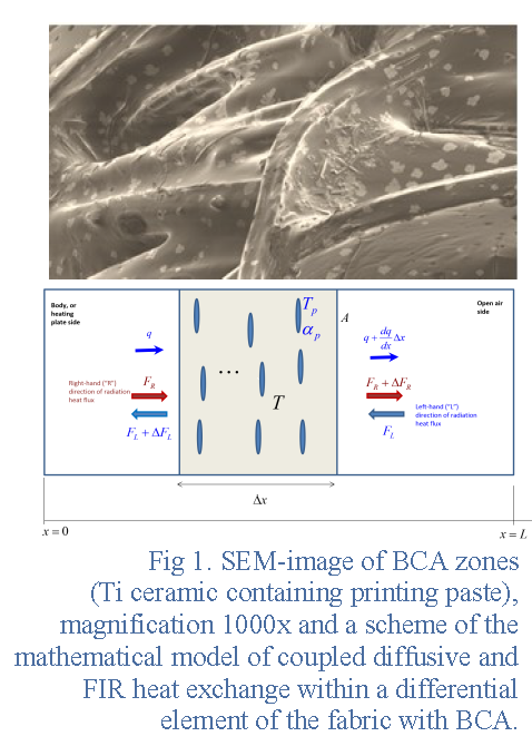 The heat resistance of fabric enhanced by bio-ceramic additives (BCAs) is investigated theoretically and experimentally in order to determine the influence of modification of the infrared (IR) absorption property of fabric. The enhanced IR sensitivity of textiles improves the thermoregulatory processes when worn in cold environments. The finite element model has been developed by taking into account the coupled phenomena of heat conduction, surface convection and the interaction of the fabric with IR power flux by employing heat transfer differential equations and the Stefan-Boltzmann law. Evaluations of IR absorptivity, reflectivity and transmissivity, the temperature transients during the hot plate chamber test and heat retaining properties of the fabric heated by an IR lamp have been obtained experimentally and simulated using the developed finite element model. The values of model parameters have been found, which provided a satisfactory match between the computation and the experiment in all considered cases. Simultaneously, the obtained values were reasonably close to rough theoretical estimations. Efforts have been made to distinguish from each other the influence of diffusive and radiative components of heat transfer, which affect the results of thermal resistance tests. The comparative analysis of contributions of different heat exchange mechanisms allows a better understanding of the peculiarities of standard heat resistance measurement procedures applied to BCA-enhanced fabrics and facilitates the validation of the computation models. rimantas.barauskas@ftmc.lt | ausra.abraitiene@ftmc.lt